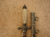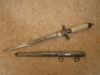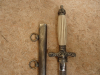 Die Scheide ist aus Leichtmetall geprägt. Der beigefarbene geriffelte Griff besteht aus Bakkelite.