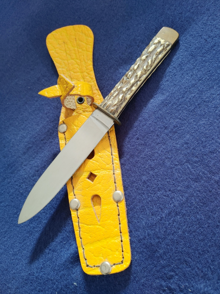 Früher überall angeboten aber inzwischen selten geworden : Altes DDR Jagdmesser in der dazugehörigen ledernen Gürtelscheide, als gebraucht angeboten, ist aber unbenutzt, leichte Lagerspuren. Klinge ca. 11,5 cm und damit § 42a-konform