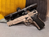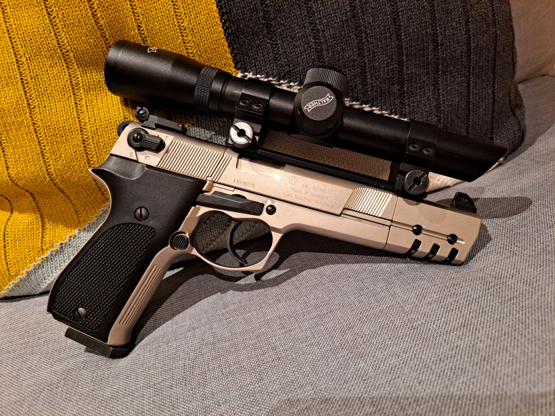 Das ist hier keine normale CP88C, ganz und gar nicht. Der Vorbesitzer hat zwei Bohrungen in den "Schlitten"-Mantel gesetzt und eine Picatinny-Schiene befestigt. Darauf thront dann ein Walther Pistolenzielfernrohr, 1x22. Klingt erstmal bastelig, ist es irgendwie auch, sitzt aber bombenfest und sieht auch noch gut aus.