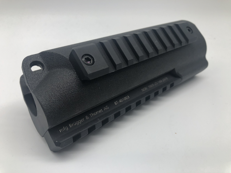 Aus Überbestand verkaufe ich hier einen original Handschutz / Vorderschaft von der Firma Brügger & Thomet (B&T) passend für die MP5 / SP5 von Heckler & Koch. Der Schaft hat alle original Hersteller Markings inkl. der NSN Nato Standard Nummer. Die seitlichen Picatinny Rails sind ebenfalls dabei. Diese sind geschraubt und können bei Bedarf auch einfach demontiert werden. Absolut neuwertig aus meiner umfangreichen Teile-Sammlung, die ich hier nun nach und nach etwas verkleinere. Zustand auch siehe Bilder.