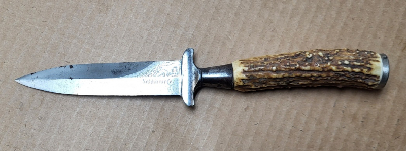 Grabendolch/Jagdmesser mit Klingenätzung: Bild und Schriftzug "Nahkämpfer". Klingenlänge: 120mm, Gesamtlänge: 260mm, Klinge wurde überarbeitet, Griffkappe aus Eisenblech, keine Scheide vorhanden. Beschreibung erfolgt nach bestem Wissen und Gewissen. Bilder sind Teil der Beschreibung. Keine Gewährleistung nach EU-Recht.