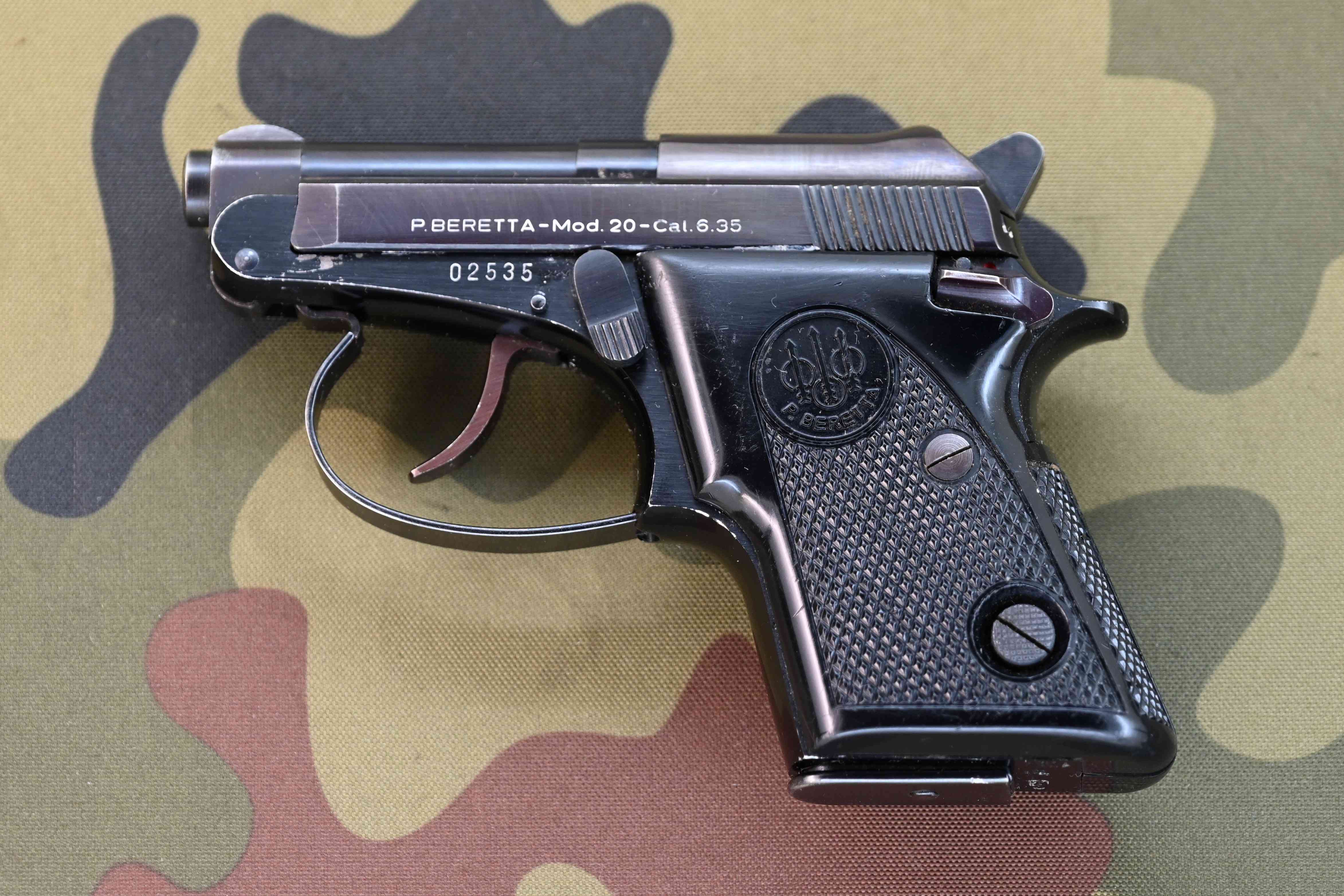 Kaliberangabe, Hersteller- und Modellbezeichnung "P. BERETTA - MOD. 20 - CAL. 6.35", Seriennummer, diverse gültige italienische Beschusszeichen ("PSF", codiert-datiert "XX7 = 1971), Herstellerschriftzug "P. BERETTA" auf beiden Griffschalen. Hinweis "MADE IN ITALY".