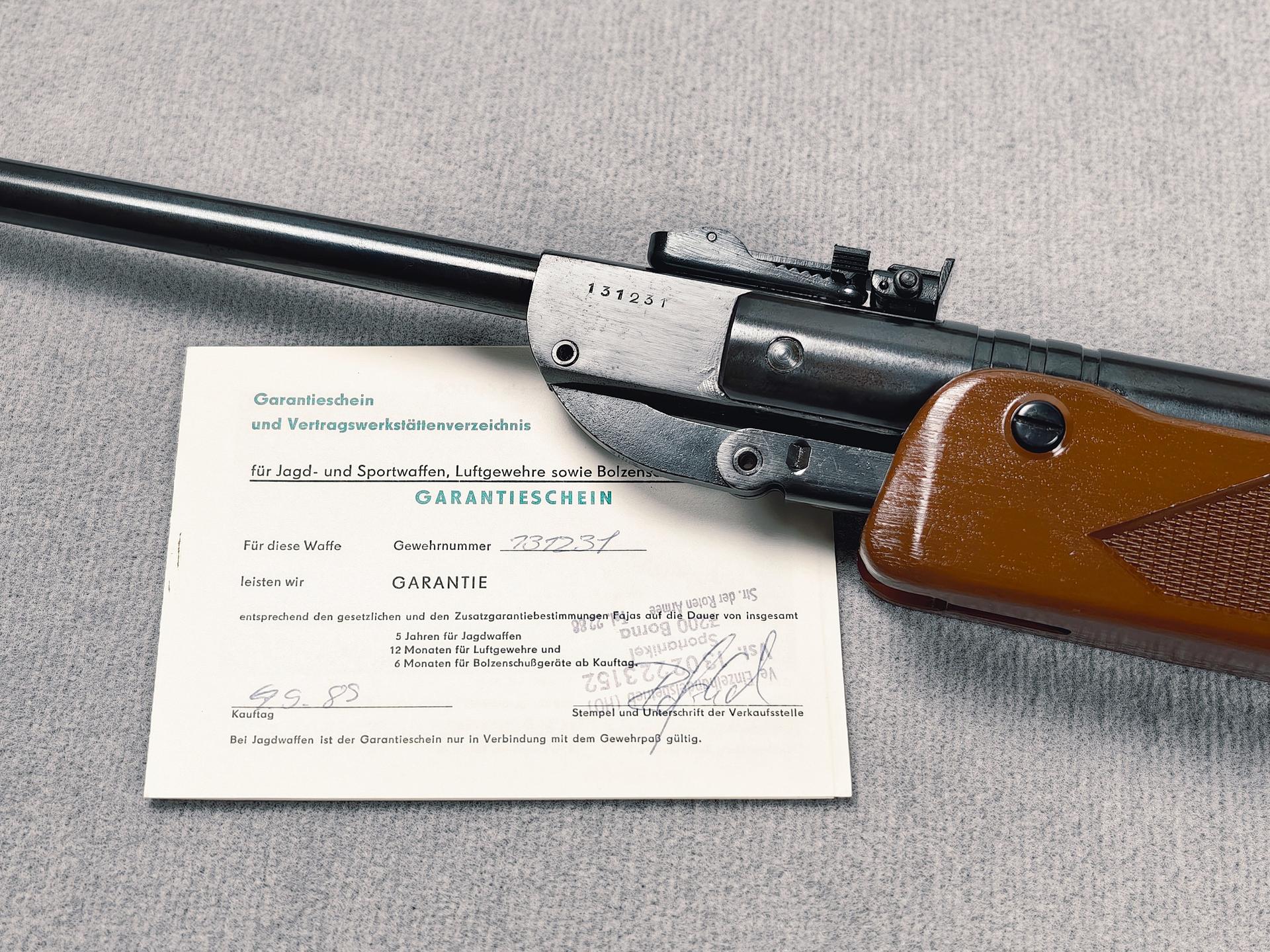 Für Sammler besonders interessant: Zu dem Exemplar ist die originale Anleitung und Garantiekarte mit übereinstimmender Seriennummer vorhanden! Daraus lässt sich entnehmen, dass das Gewehr im September 1989 in Borna ausgeliefert wurde. Tatsächlich befand es sich jahrzehntelang in erster Hand, bevor es 2023 dann "regional" den Weg in meine Sammlung nahm.