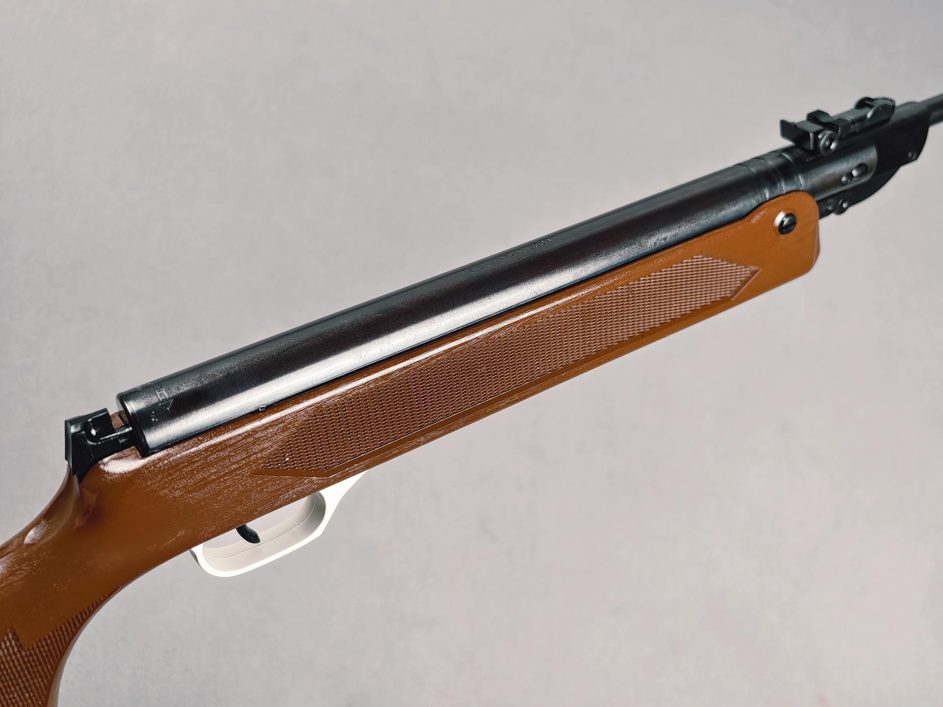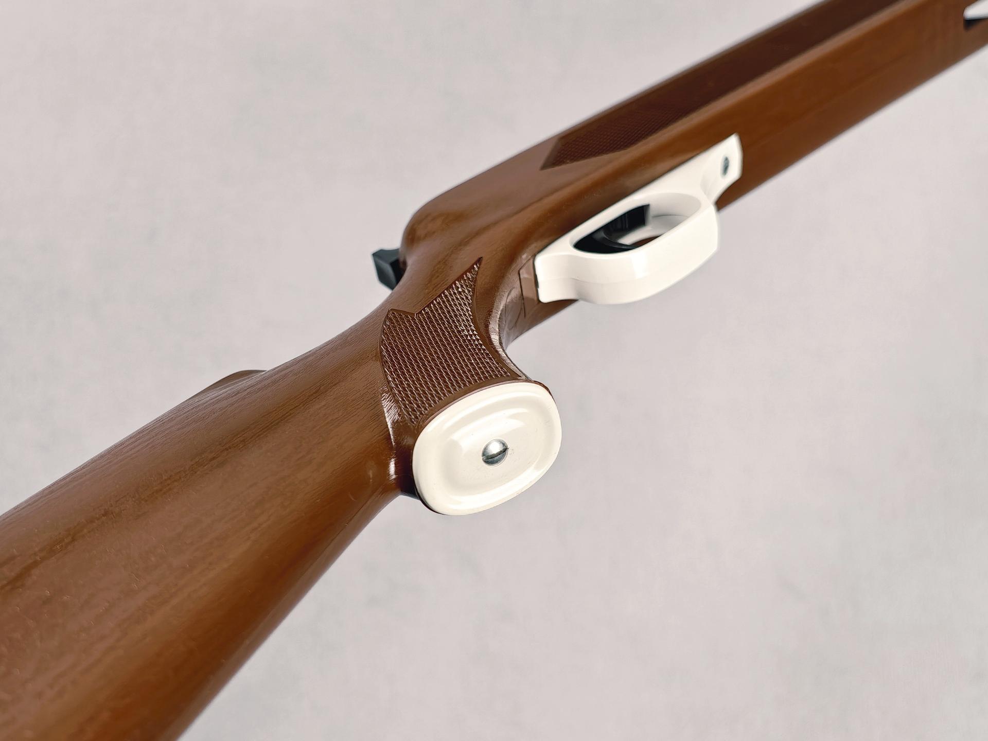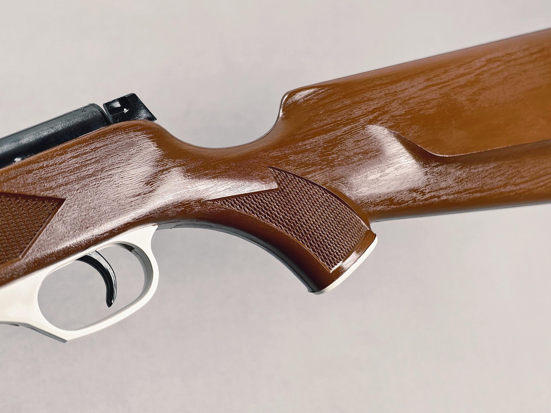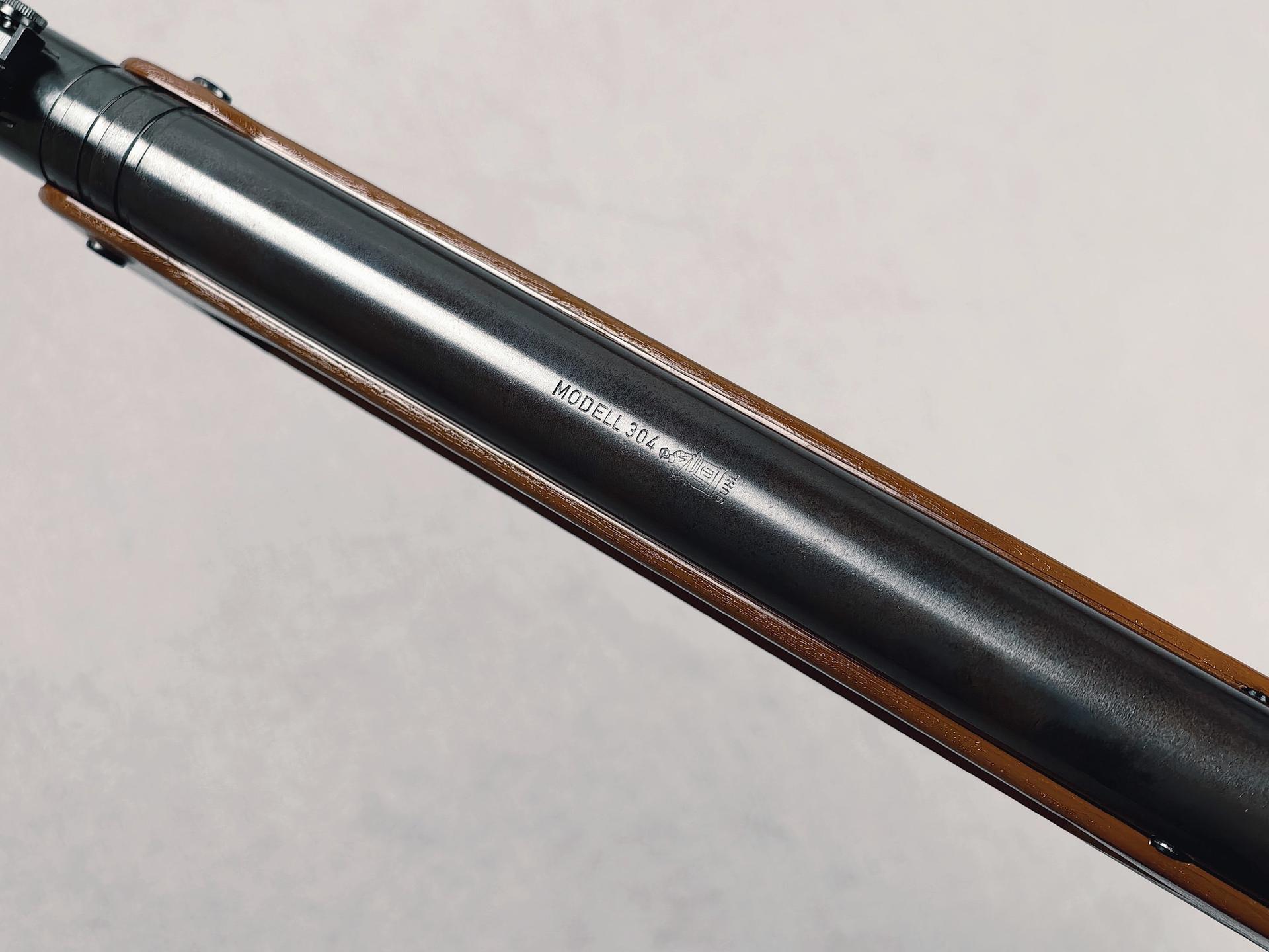 Aus meiner Privatsammlung versteigere ich ein Haenel Modell 304. Dieser DDR-Knicker basiert auf dem Haenel 303, wurde aber als Novum mit einem Kunststoffschaft ausgestattet. Die Kunststoffschäfte gab es in verschiedenen Gestaltungen - dieser hier ist die anspruchsvollste Variante mit Holzimitat-Oberfläche und weißen Applikationen.