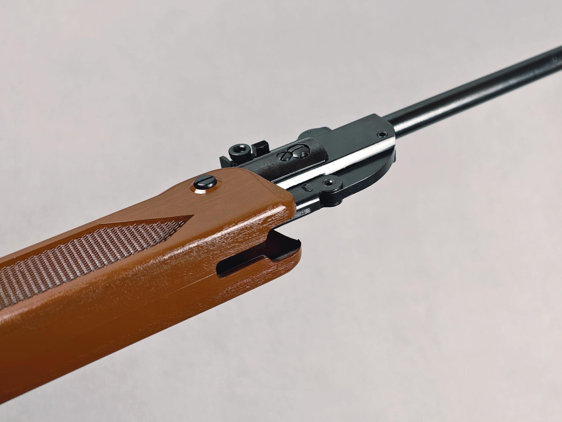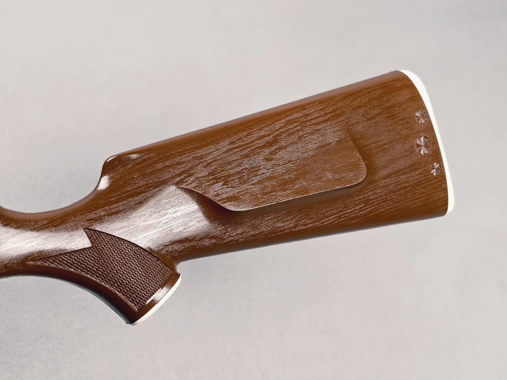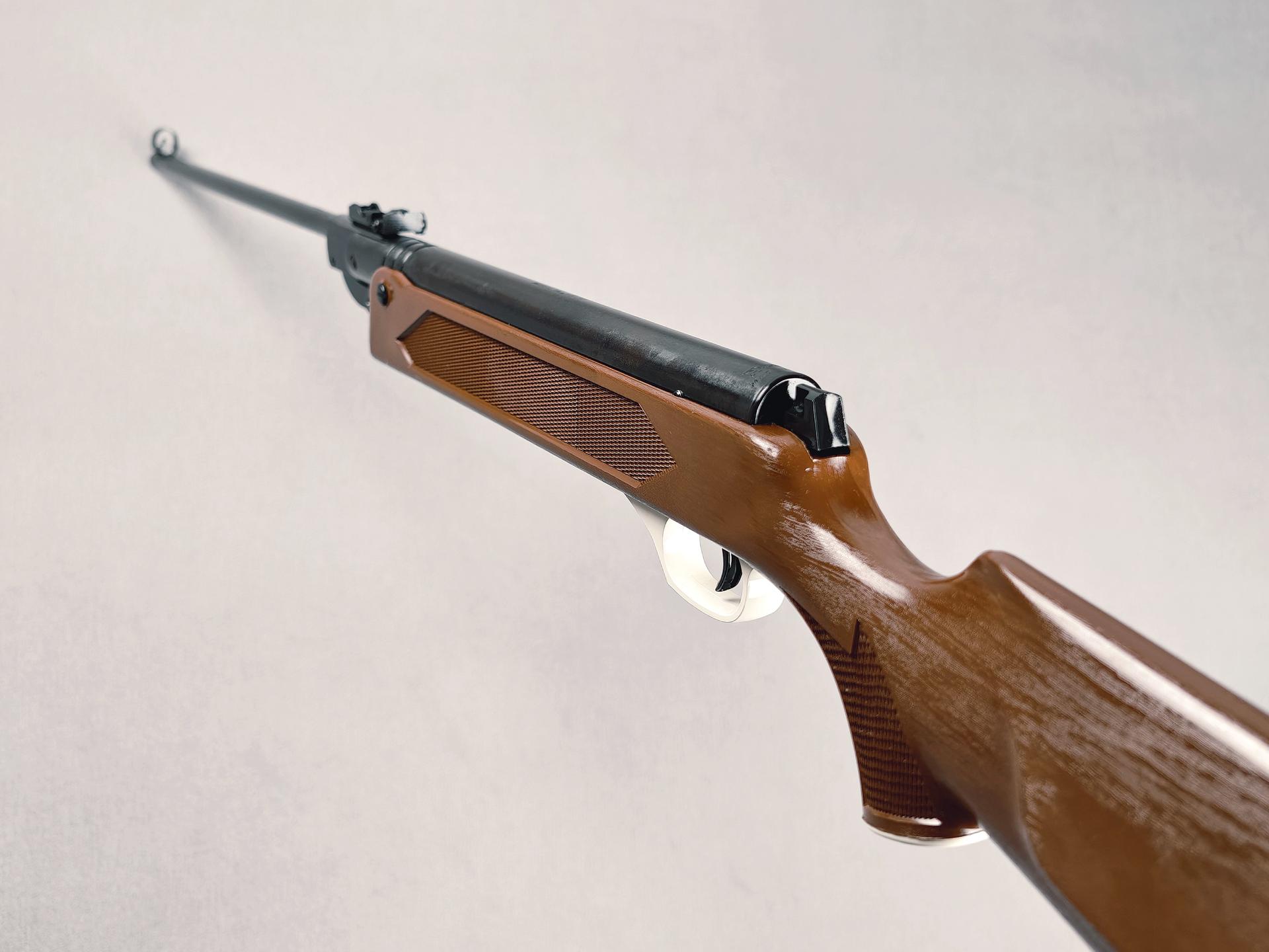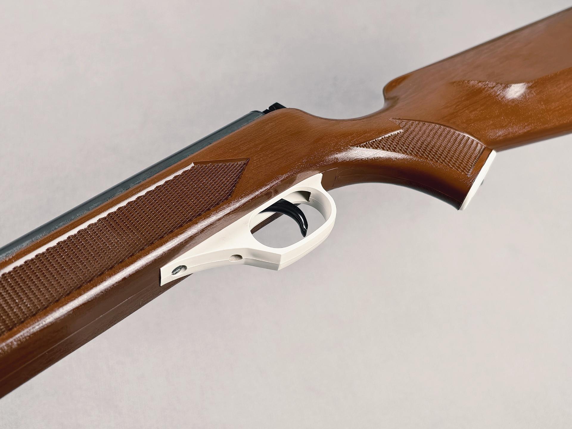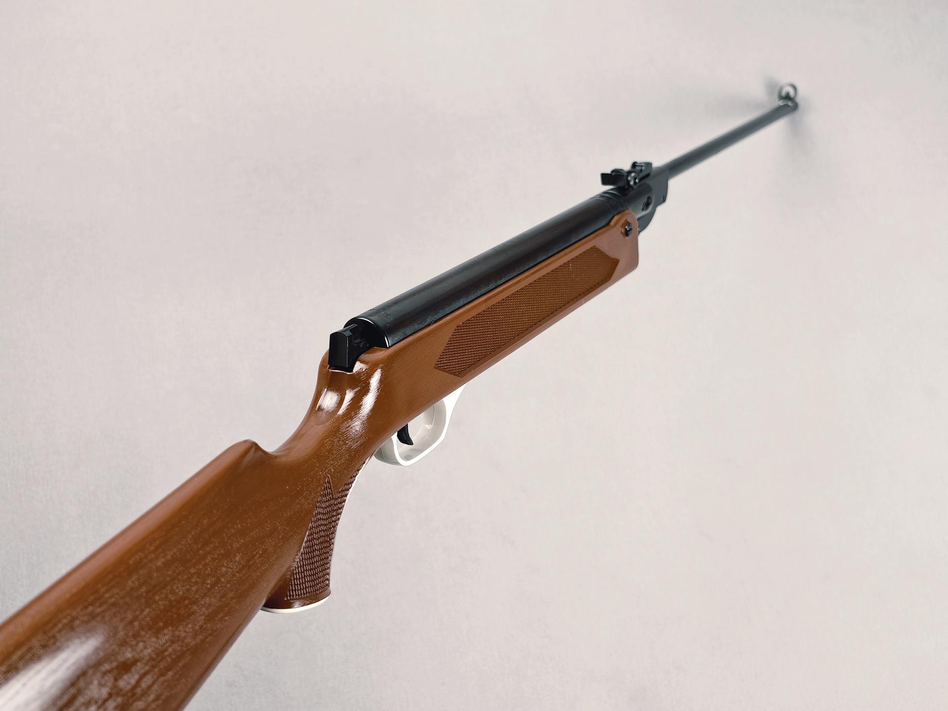 Aus meiner Privatsammlung versteigere ich ein Haenel Modell 304. Dieser DDR-Knicker basiert auf dem Haenel 303, wurde aber als Novum mit einem Kunststoffschaft ausgestattet. Die Kunststoffschäfte gab es in verschiedenen Gestaltungen - dieser hier ist die anspruchsvollste Variante mit Holzimitat-Oberfläche und weißen Applikationen.
