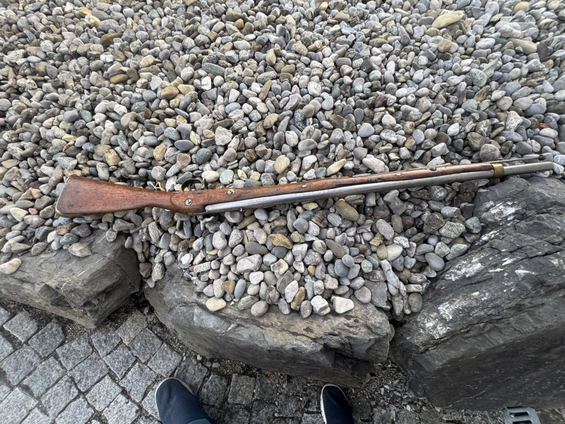 Perkussionsbüchse, Colonialmodell, Kal. 20mm LL 805mm, TL 1210mm, blank gebürsteter Rundlauf, Kimme und Korn aufgelötet. Flache polierte Schlossplatte. Nussholzschäftung mit diversen Reperaturstellen, Messinggarnitur, eiserner Ladestock. #