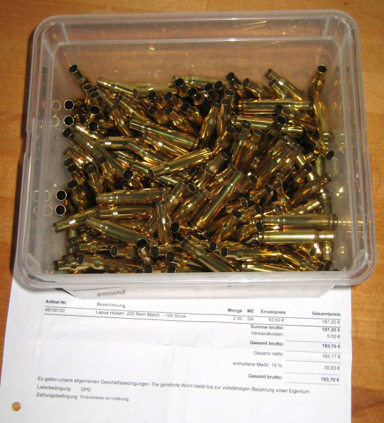 Biete 200 gereinigte Lapuahülsen, der Hülsenhals wurde kalibriert. Sie stammen aus einer Charge. Die Originalrechnung in Höhe von 187,20€ liegt bei.