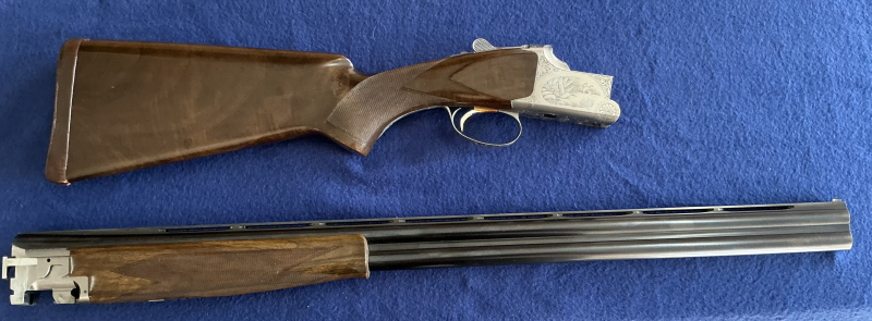 Browning B25 mit Gravur B2G Sporting Kal. 12 / 70 mit Fix-Choke ( 3/4 und 1/4 ) Lauflänge 76cm , Sporting Broadway-Schiene, Hilfkorn , ventiliertes Laufbündel, Einabzug, Ejektor und Sicherung mit Umschalter.