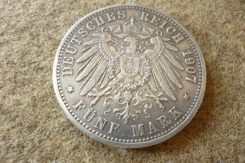 FÜNF MARK DEUTSCHES REICH 1907: WIlHELM II DEUTSCHER KAISER KÖNIG VON PREUSSEN. Silber, Gewicht ca. 25 Gramm, Durchmesser ca. 38 mm. Herstellung: A = Berlin, keine besonderen Schäden, altersmäßig nur geringe Abnutzungen