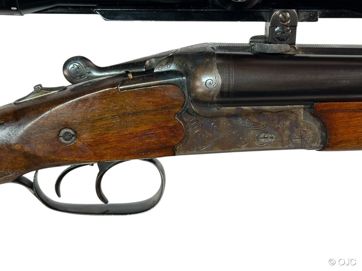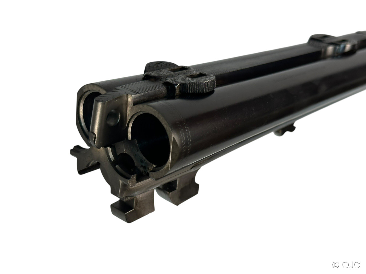 Es handelt sich um Gebrauchtware - also eine Waffe mit typischen, altersbedingten Gebrauchsspuren (hier und da ein paar Kratzer im Schaft, leichter Brünierungsabrieb, etc...), aber immer noch gut! Die Läufe sind blank, die Schlossmechanik funktioniert einwandfrei! Der Hülsenanheber wurde im Bereich des rechten Laufes leicht eingeschnitten, was auf die einstige Verwendung eines Einstecklaufes hindeutet. Dies tut der Funktion natürlich keinen Abbruch, wir weisen nur auf dieses interessante Detail hin.