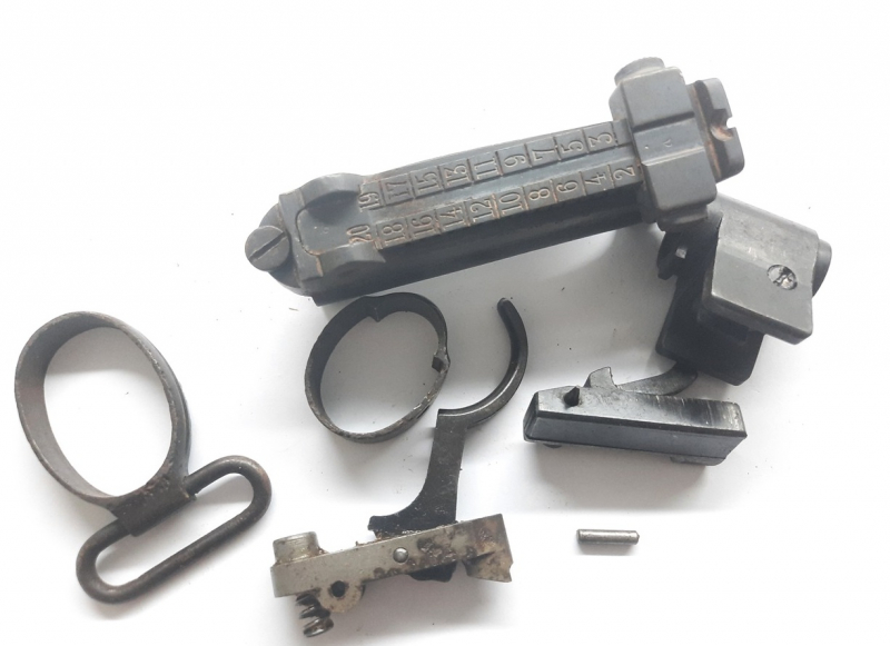 Angeboten ist ein Konvolut Ersatzteile Kleinteile Visier Abzug Schloßhalter Oberring Unterring Mauser–Vergueiro DWM 1904, 6,5x58mm Vergueiro, Teile Freie.