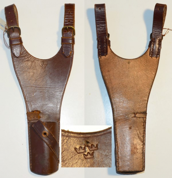Original Koppelschuh aus mittelbraunem Leder, schwedische Abnahme, für Bajonett Schweden Mauser 1896, oberhalb der Tasche wurde ein Riemen entfernt