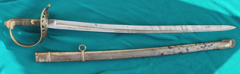 Leicht geschwungene Rückenklinge, Vorderseite gekehlt, Rückseite am Ansatz Marke Solingen? Eiserner durchbrochener Korb. Holzgriff mit Fischhaut sowie gedrillte Drahtwicklung (Messing). Eiserne Scheide mit feststehendem Ring, oberhalb rückseitige Anhängung. Gesamtlänge mit Scheide 94cm. Klingenbreite circa 3,3cm.