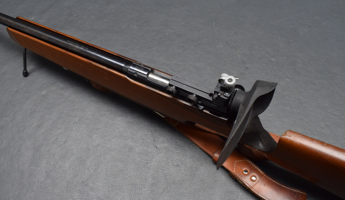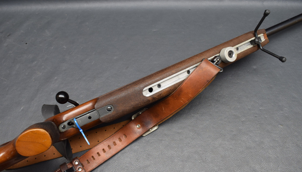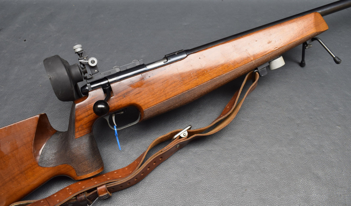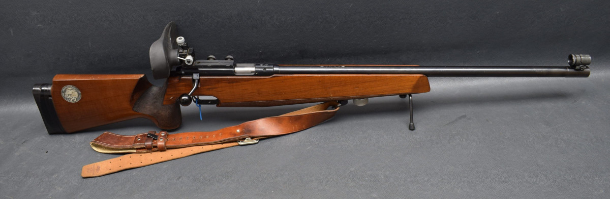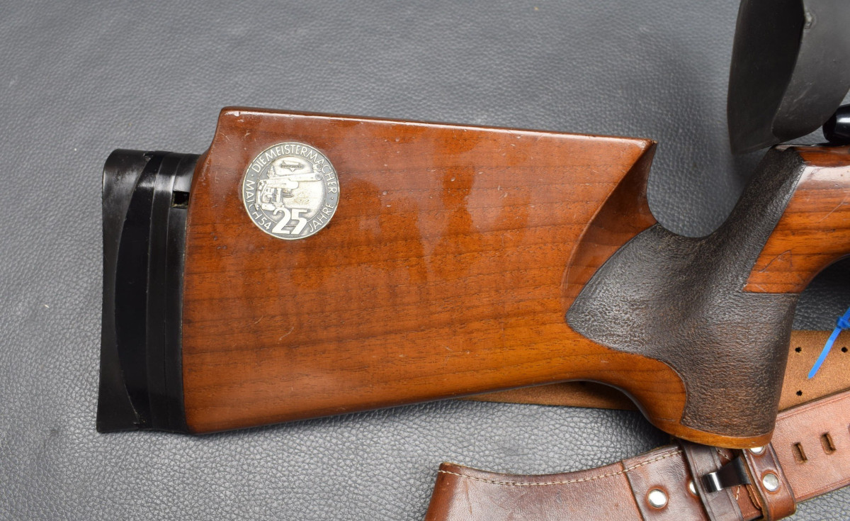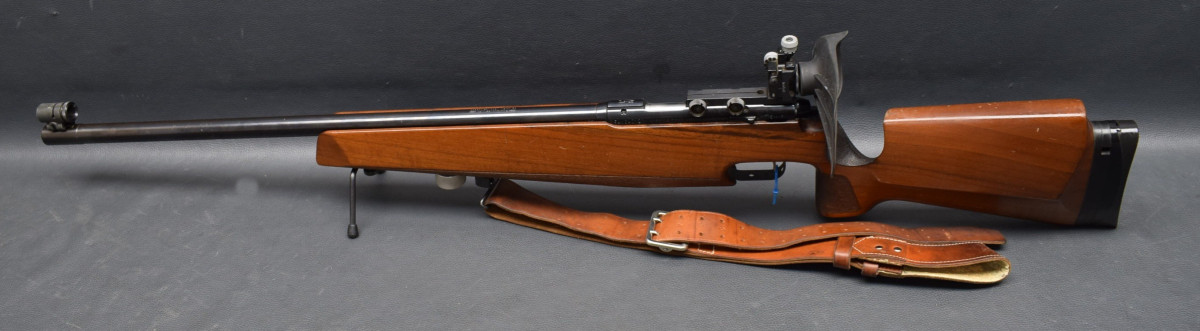 21 mm dicker Matchlauf, 11 mm Schiene, Diopervisierung, Zylinderverschluss mit Flügelsicherung, einstellbarer Matchabzug. Nussbaumschaft mit verstellbarer Schaftkappe, 11mm UIT Schiene, HAndstop mit Riemen, Zweibein. Lauf sehr gut, Brünierung 96%, Schaft mit Gebrauchsspurren, Gebrauchtwaffe
