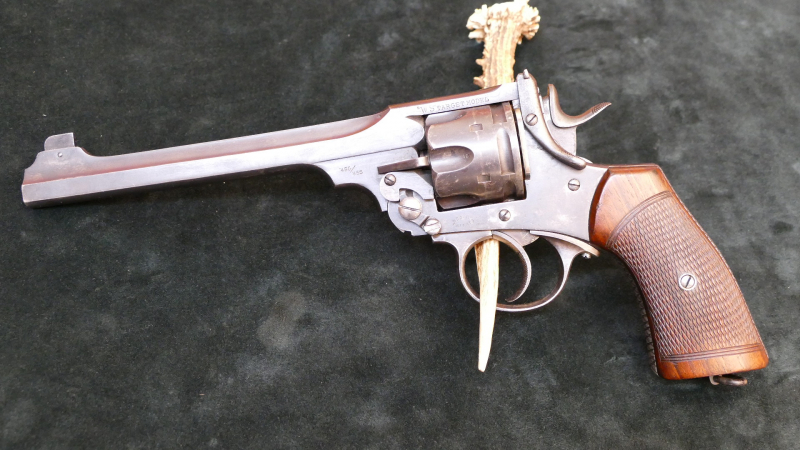 "P. Webley & Son. London & Birmingham" W. S. Target Model, Kal. .455 W&S, Erhaltungszustand altersgemäß sehr gut (ganz leichte Rostnarben und Abriebspuren), Originalzustand (nicht neu brüniert, leider wurde das Griffstück vorne und hinten mit einer "Fischhaut" nachträglich verunstaltet), Lauf leicht rau, keine großen Rostnarben, funktionstüchtig.