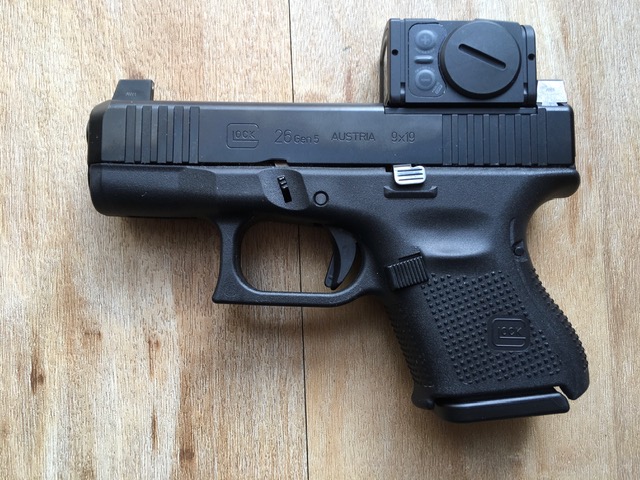 Sie bieten auf eine Glock 26 Gen. 5 MOS FS Kal. 9mm Luger mit Acro C2 auf B&T Montageplatte und GNS/GMS als Nacht- und Backupvisier.