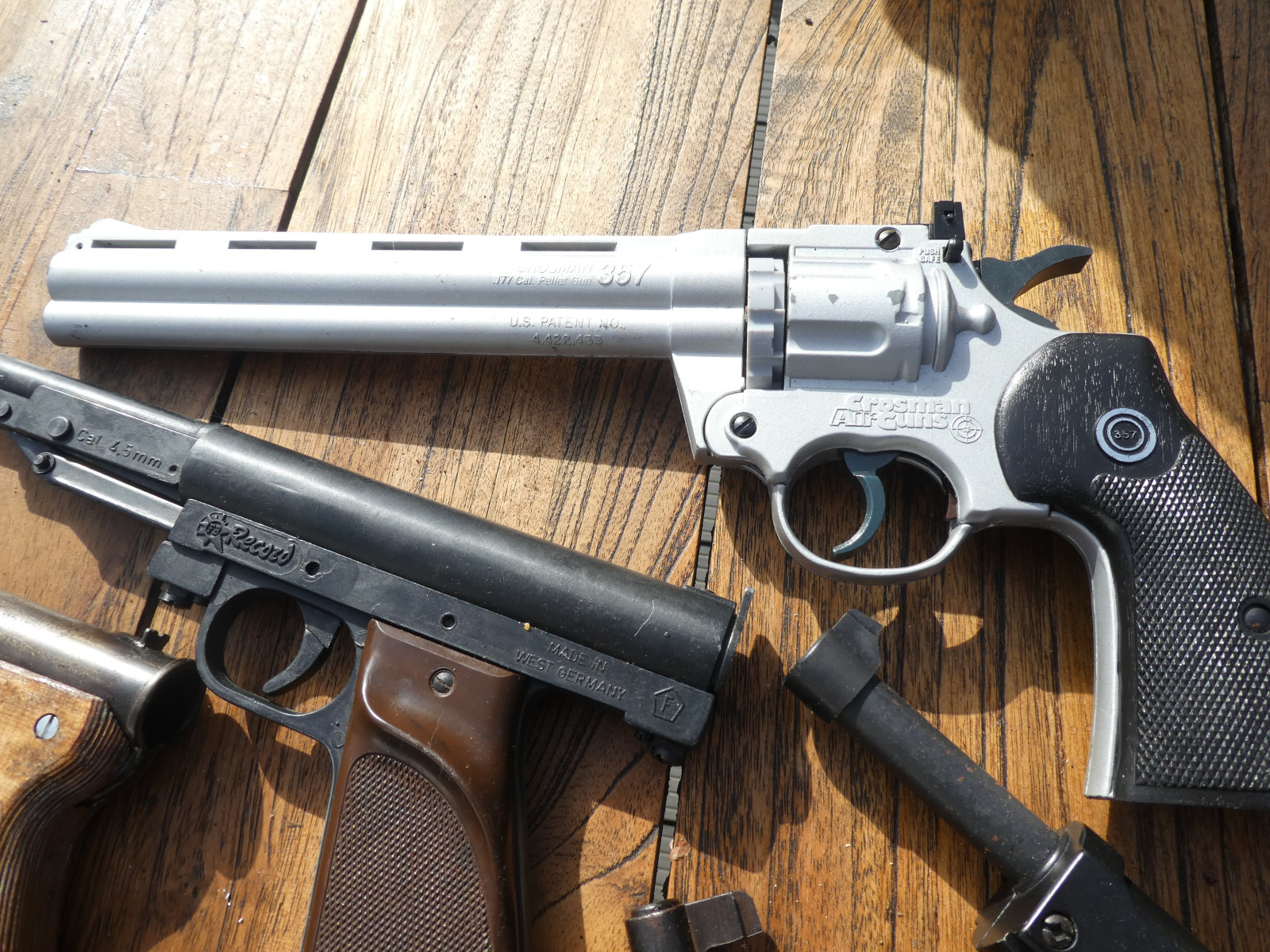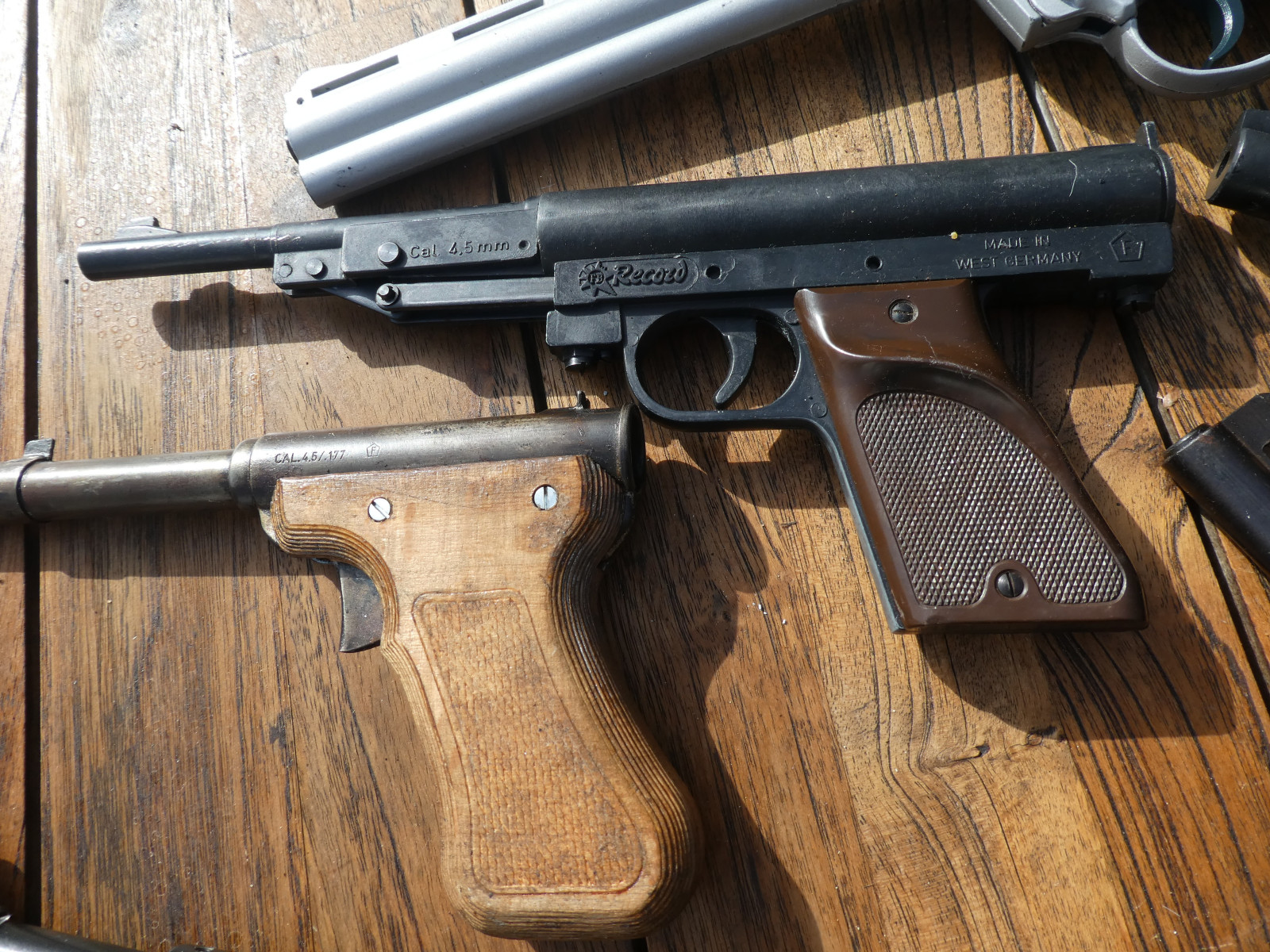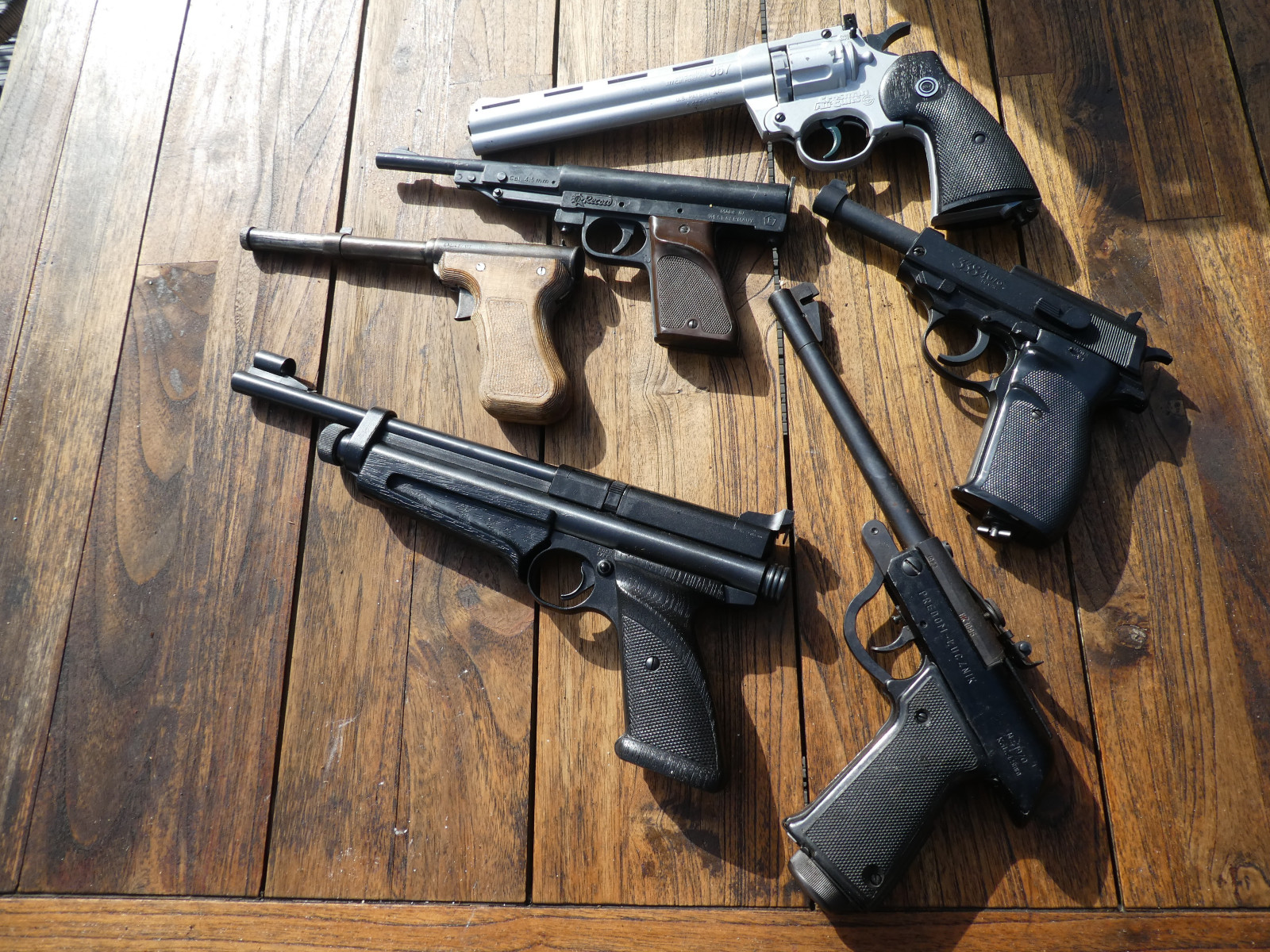 Viele alte Druckluftpistolen, verschiedene Hersteller, verschiedene Herstellungsjahre, alle mit dem F im Fünfeck.