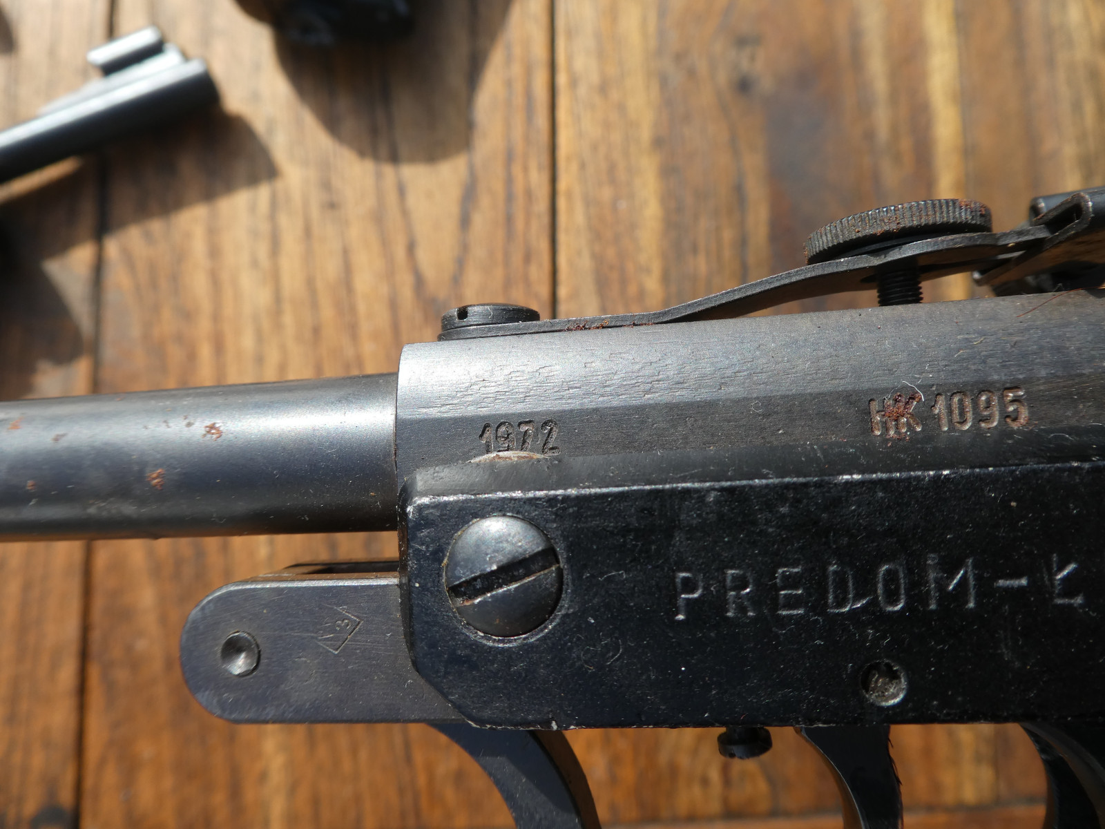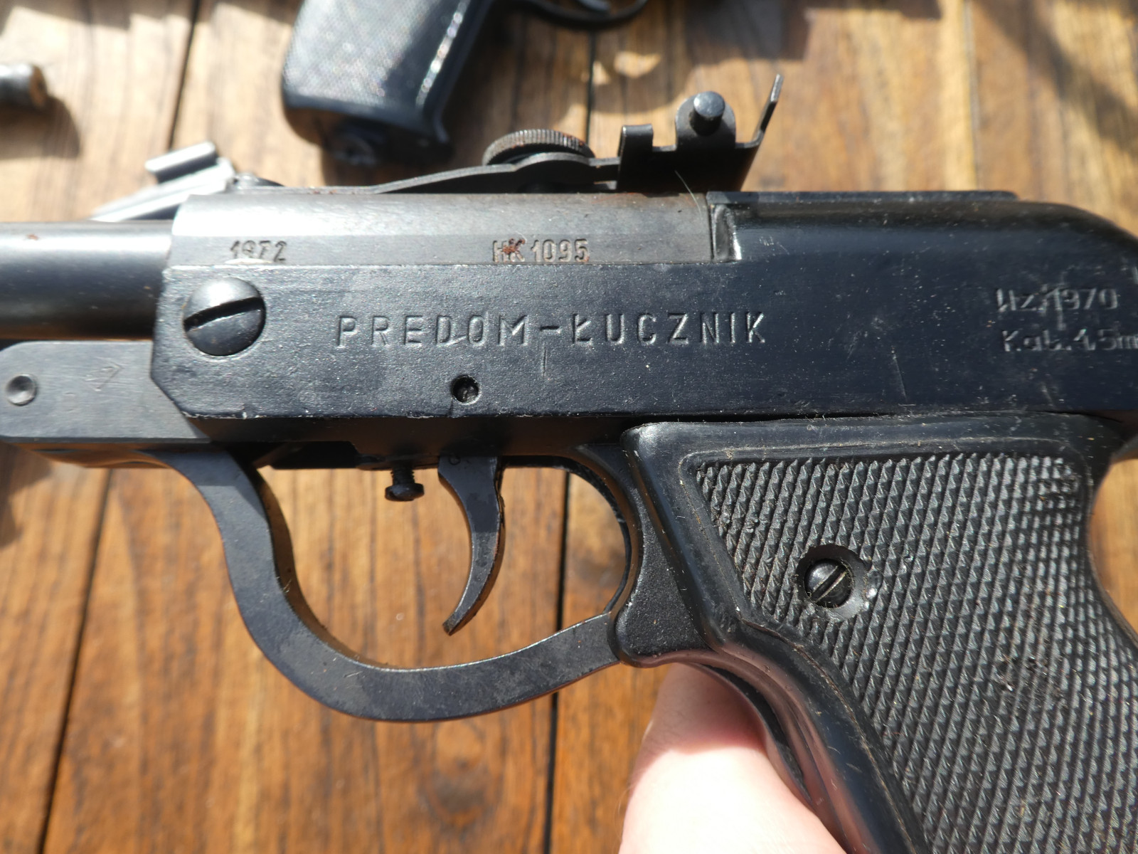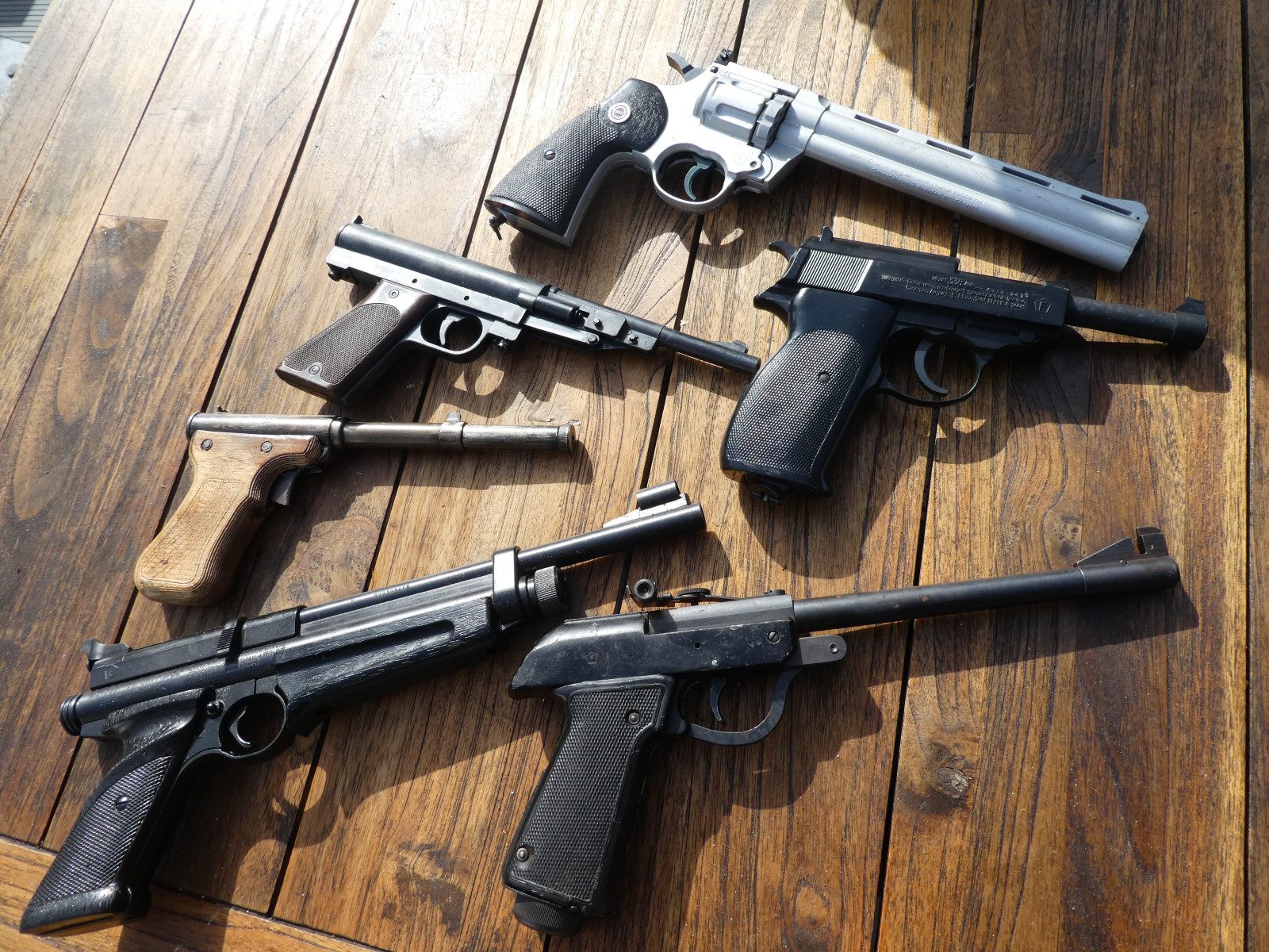 6 alte Luftdruckpistolen, alle mit F im Fünfeck,