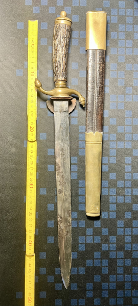 Zum Verkauf steht ein mutmaßlich alter Hirschfänger bzw. ein altes Jagdseitengewehr mit Scheide.