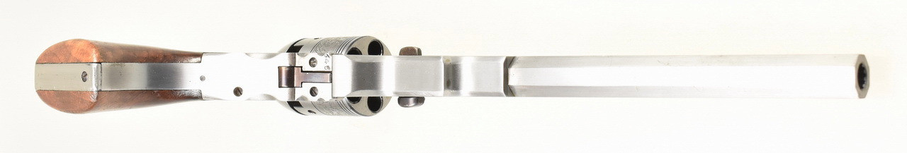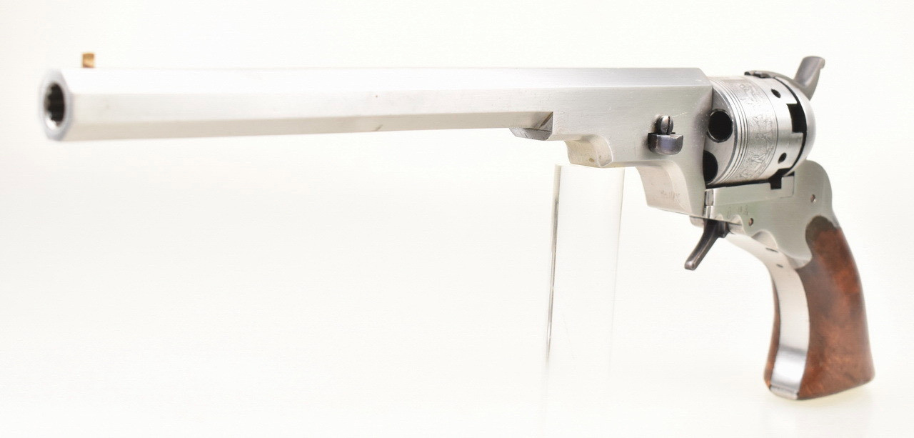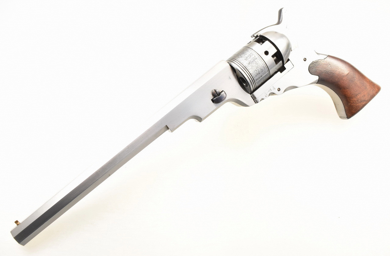 Hervorragende " White Finish " Replika aus italienischer Produktion eines Colt Holster Model Paterson Revolver No. 5 ; auch als " Texas Paterson " bekannt. 5 - Schuß Trommel. Blanker 9" Achtkantlauf. Beschuß 1967. Holzgriffschalen. Gebrauchs- und Lagerungsspuren sind vorhanden. Details siehe Bilder.
