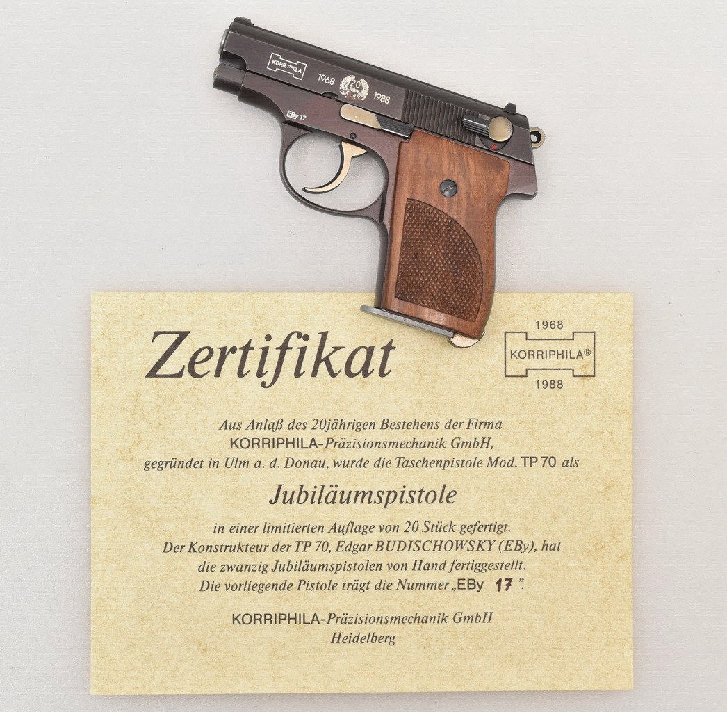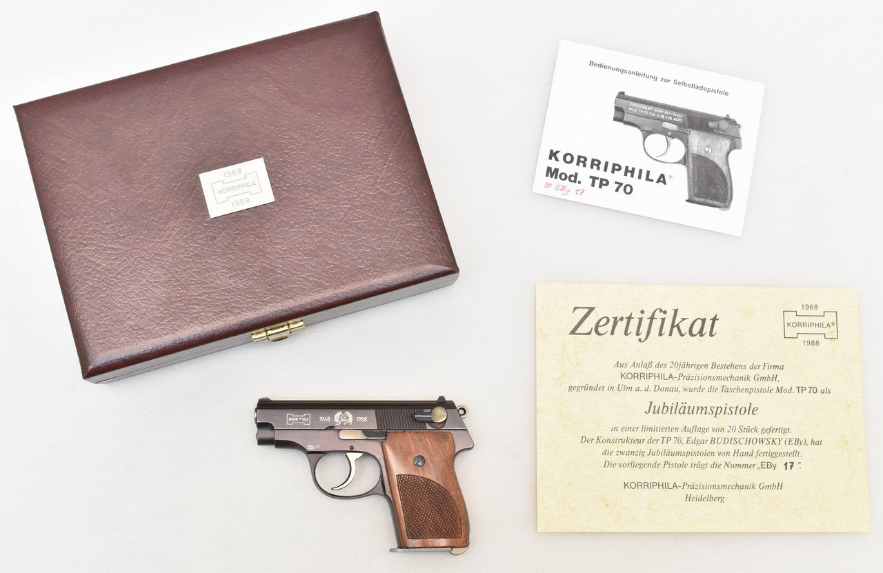 Handliche, sechsschüssige Double - Action Taschenpistole in Ganzstahlbauweise des deutschen Herstellers Edgar Budischowsky KORRIPHILA Modell TP 70 in der auf 20 Stück limitierten JUBILÄUMS - AUSFÜHRUNG. Spiegelblanker Lauf. Ulmer Beschuß 1991. Holzgriffschalen mit feiner Fischhaut. In der originalen Präsentationsbox mit Zertifikat und Bedienungsanleitung. Details und Zustand siehe Bilder.