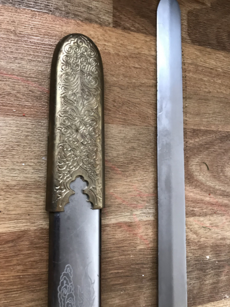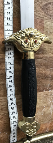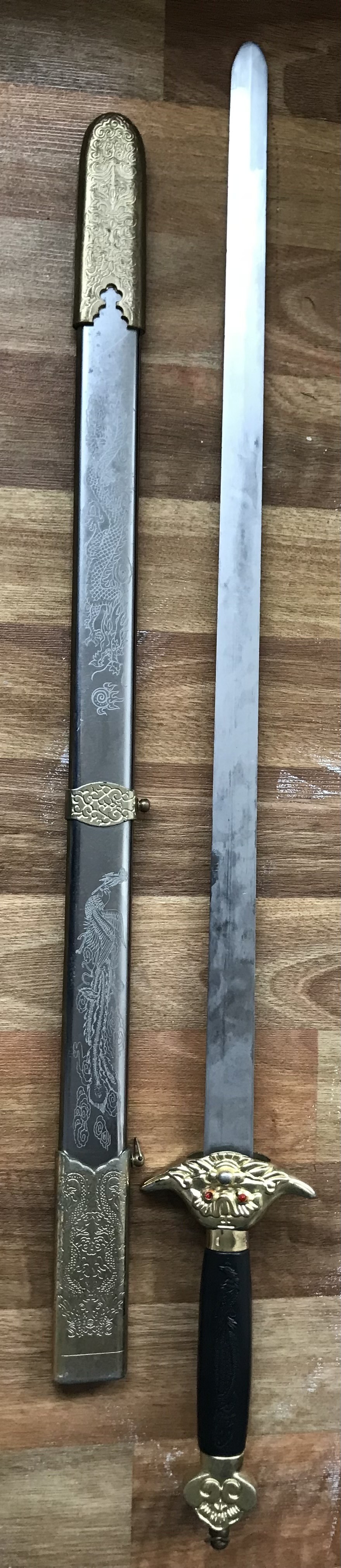 Das Schwert ist ein chinesisches Jian Schwert mit Drachen- und Phönixmotiven.