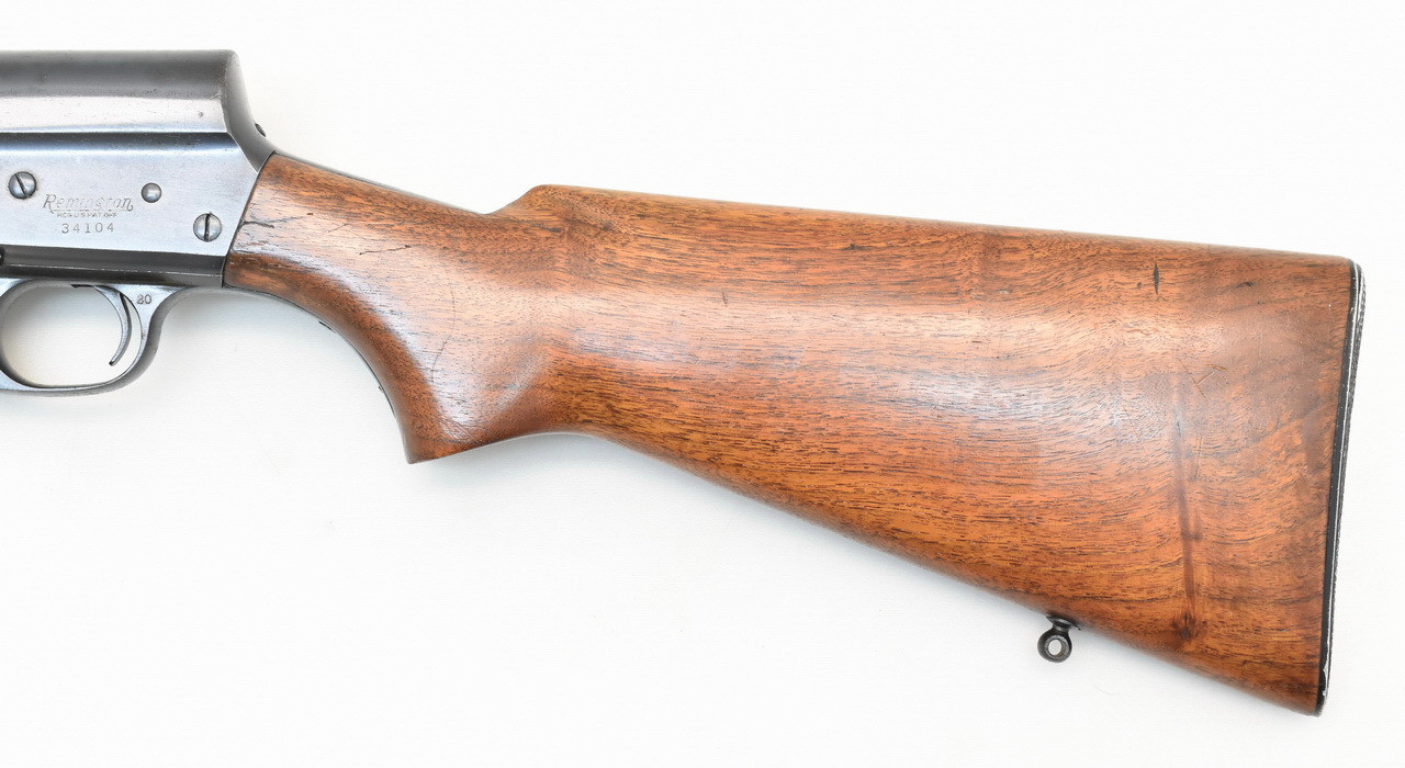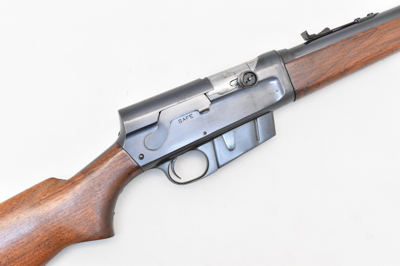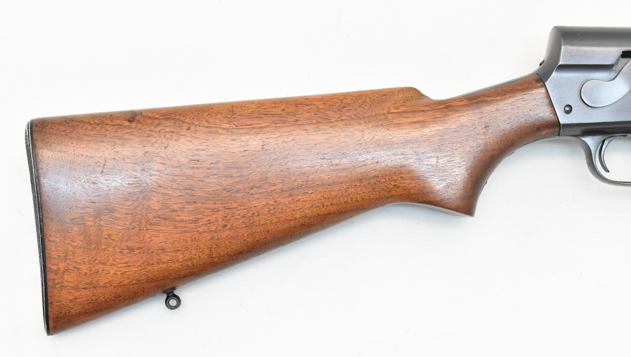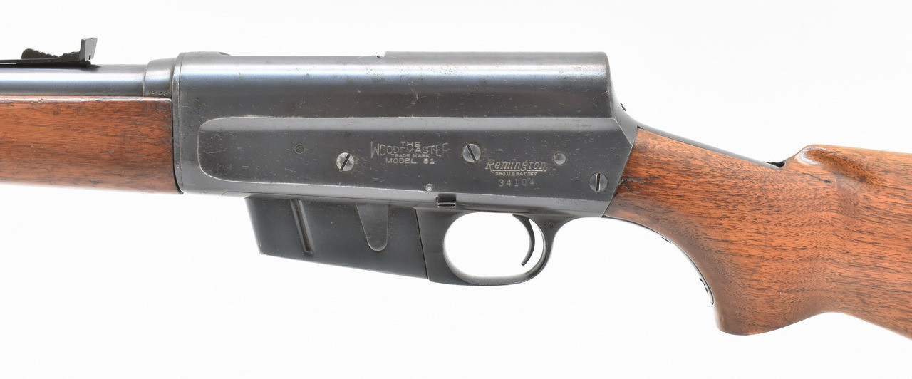 Interessante " Take - Down " Selbstladebüchse mit Drehwarzenverriegelung des bekannten Waffenkonstrukteurs John Moses Browning. Das REMINGTON Mod. 81 " THE WOODSMASTER ". Blanker 21,8" Originallauf. Belgischer Beschuß. 5 - Schuß Kastenmagazin. 345mm lange Pistolengriffschäftung für Rechts- und Linksschützen ( Schaftlänge gemessen vom Abzug bis Mitte Schaftkappe ). Unüberarbeitete Metallteile mit partiellen Flugrostanhaftungen. Details siehe Bilder.