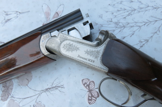 Sehr schöne Perazzi MX8 mit dezenter Gravur und extra gutem Sportingschaft (belederte Schaftkappe, Holzklasse 10, in Öl geschliffen).