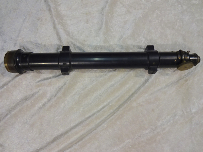 Mir unbekannte Zieloptik. 40 cm lang, über 1 kg Gewicht in schön brüniertem Stahl. Sehr guter Zustand auch die durch Rändelschraube verstellbare Optik ist gut. Wer Bescheid weiss, bitte melden. Sicherlich ein extrem seltenes Exponat. Leider keinerlei Beschriftung. Sicherlich 1.Weltkrieg oder davor gefertigt. Originalität wird zugesichert. Privatverkauf.