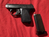 Nachlassfund: alte kleine Taschenpistole,Schreckschuss und Gas,Modell =S= ,Kal.8mm,aus dem Hause HS H. Schmidt Ostheim-Rhoen,Bj.ca. 1970,mit Seriennummer,PTB 99-96,Single-Action Pistole mit Schlagbolzenschloss und Einsteckmagazin für 6 Patronen,Gesamtlänge ca. 11,5cm,