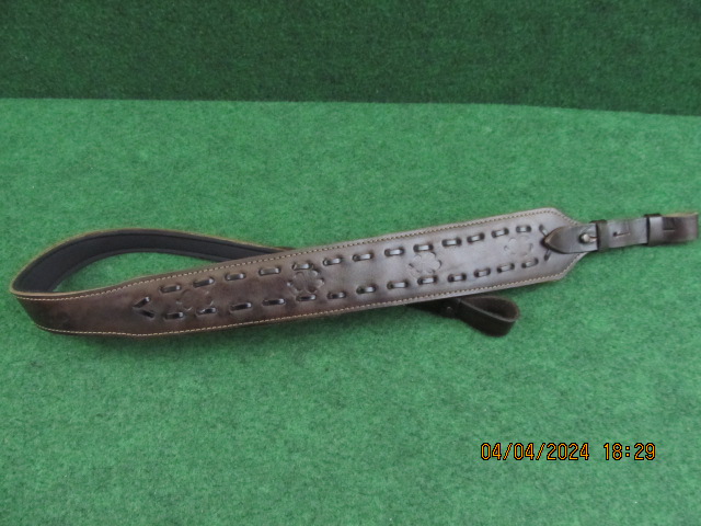 Dieser wunderbar gefertigte Gewehrriemen aus echtem Rindleder hat eine Länge von ca. 104 cm. Der Riemen ist mit schönen Lederarbeiten und Verzierungen geschmückt. Durch die qualitativ sehr hochwertige Verarbeitung ist der Riemen sehr robust und widerstandsfähig. Dies ist keine Stangenwahre, sondern beste Sattlerarbeit. Der Riemen hat über die gesamte Länge auf der Rückseite / Trageseite eine Polsterung sowie eine Antirutsch-Oberfläche zum bequemen und sicheren Tragen. Die Länge des Riemens ist beidseitig um 3 Löcher verstellbar (6,5 cm!!). Die Farbe ist Braun.