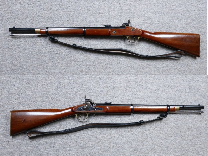 Parker-Hale-Musketoon P/61, mit Riemen und Pistonschutz, Lauf mit 5 progressiven Zügen (an der Mündung 0,005“ tief, an der Schwanzschraube 0,013“), spiegelblanker Lauf, Seriennummer 7942, gefertigt 1973, mit Parker-Hale-Schaftstempel. Direktabzug, äußerlich perfekter Zustand, keine sichtbaren Schuss-Spuren, wahrscheinlich nicht geschossen. Gültiger britischer Beschuss.