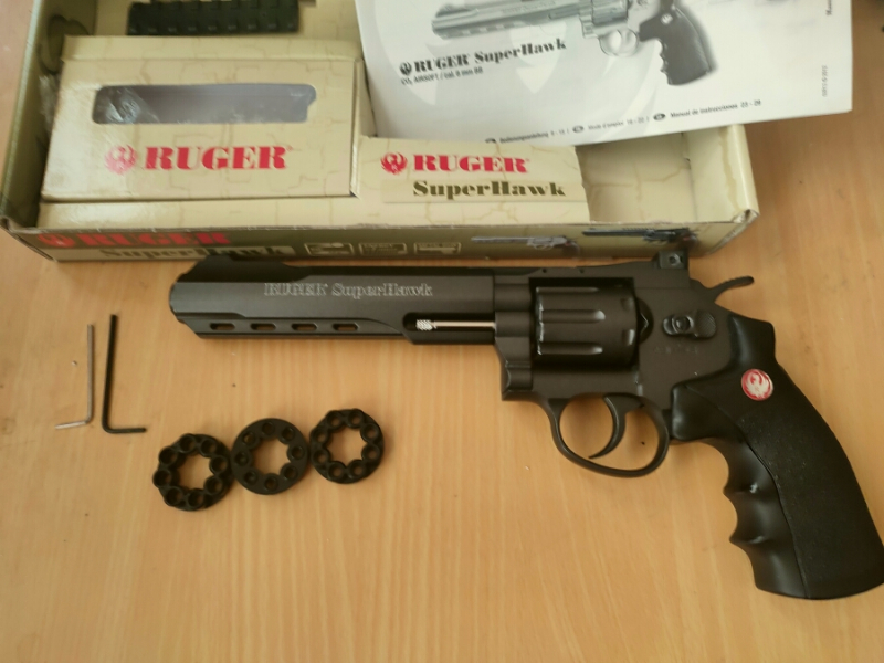 Revolver Ruger SuperHawk in der 6-Zoll-Version, Kaliber 6 mm BB, CO2-Antrieb, F-Zeichen, insgesamt drei Trommelringe, schweres Teil mit etwa 3 Joule Leistung! Die Griffschale ist locker und wackelt etwas, da müsste man sich etwas einfallen lassen, wenn es stört. Es hat jedoch fürs Schießen keinerlei funktionelle Bedeutung. Kommt in Originalverpackung.