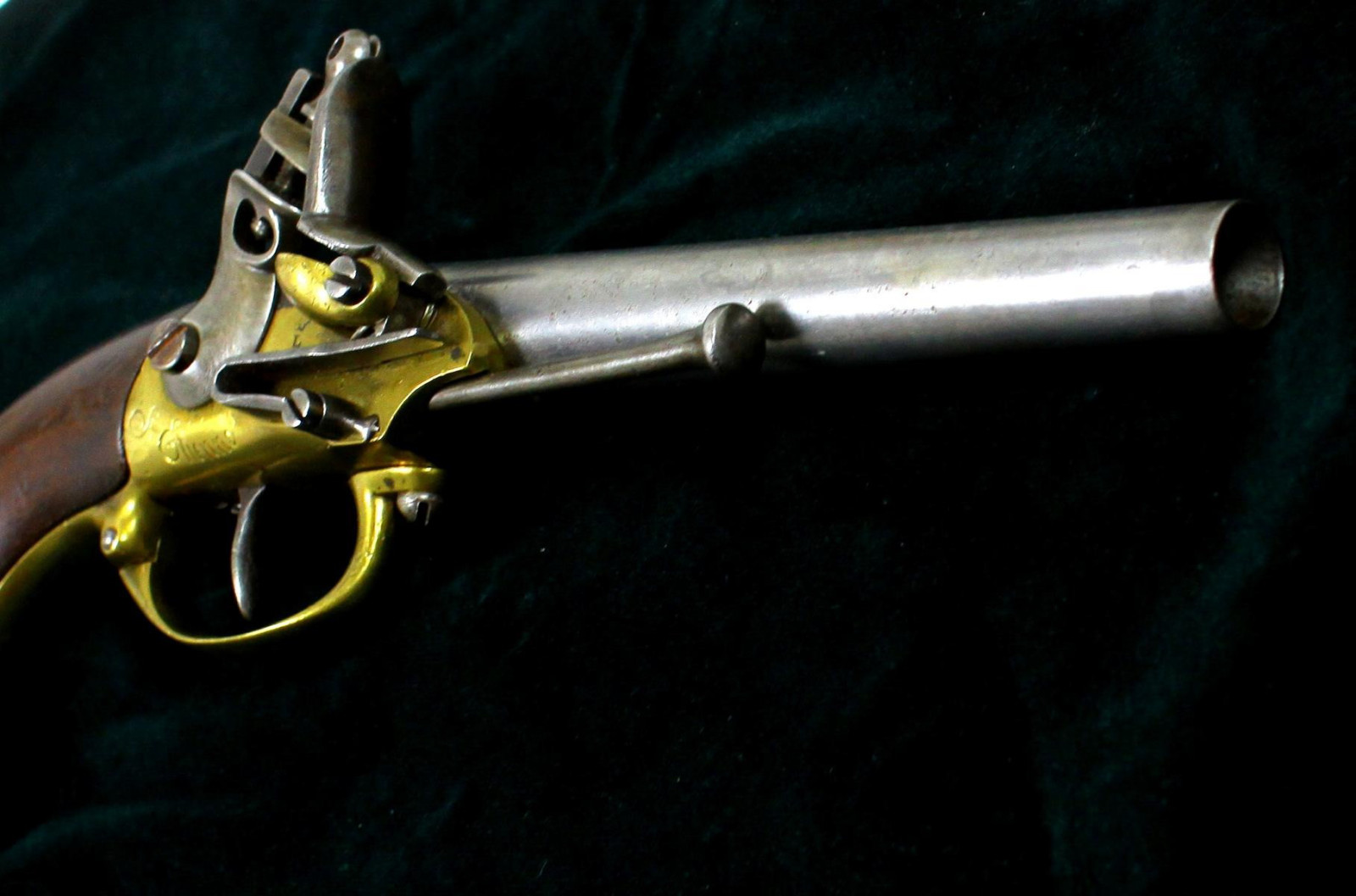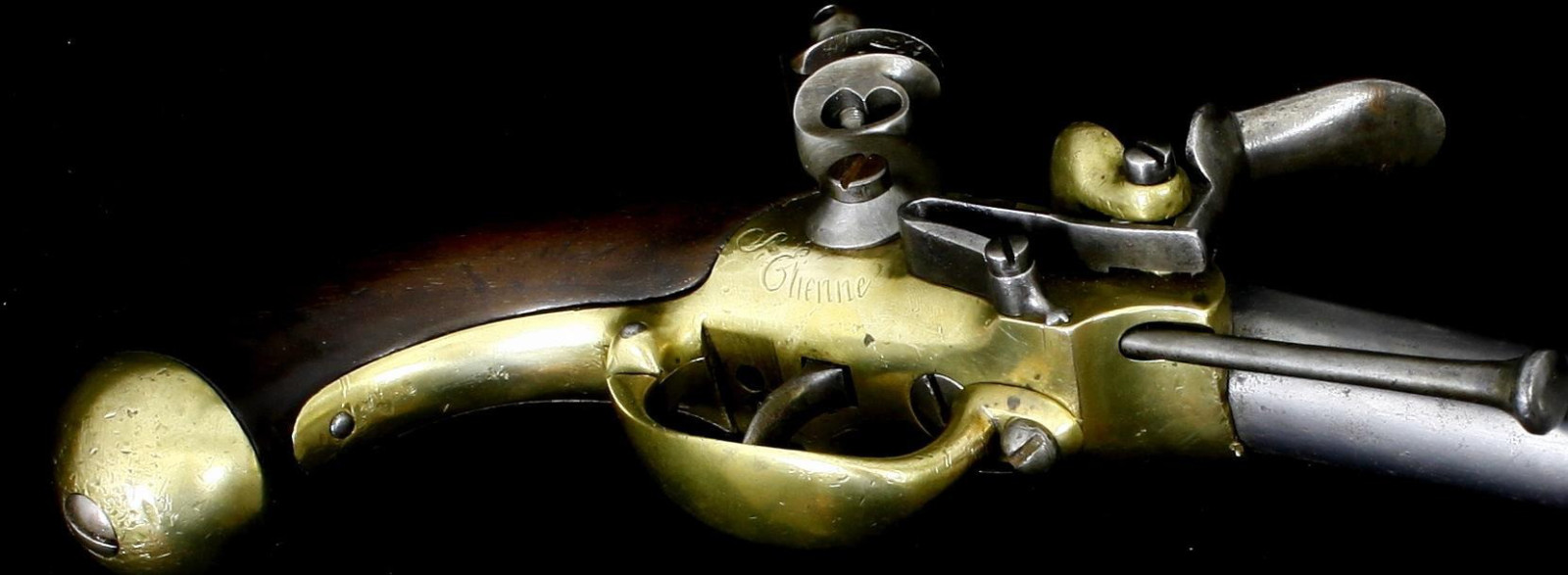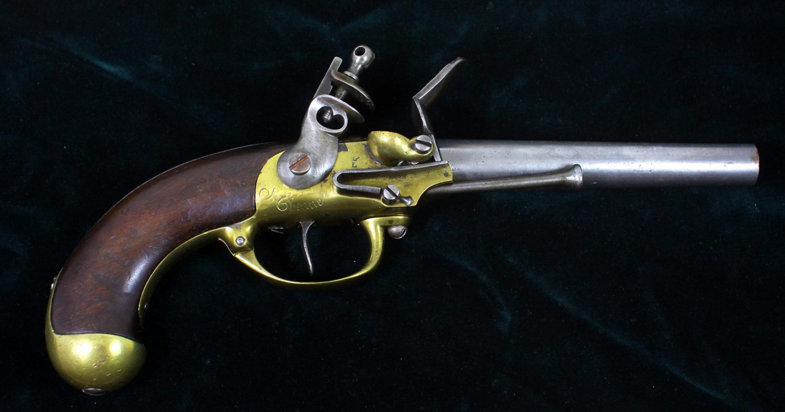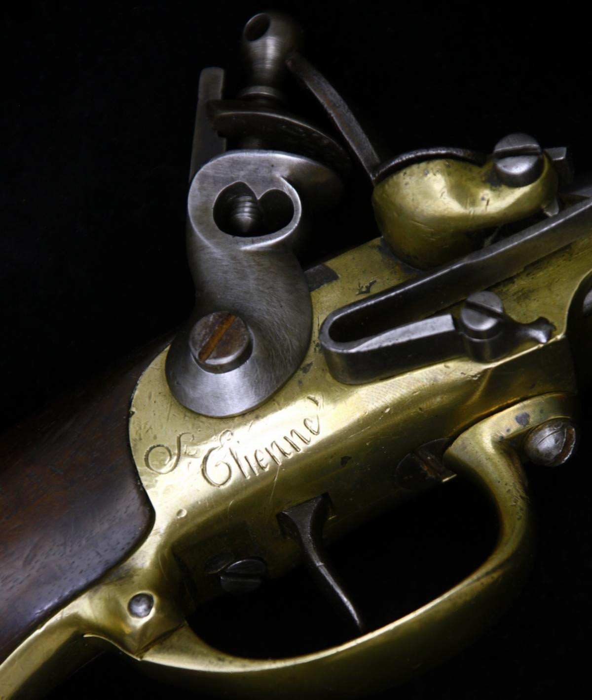 Schlosskasten aus Messing, bezeichnet "St. Etienne" Griff aus Nussholz Eiserner Ladestock. Inspector-Marke L unter Krone