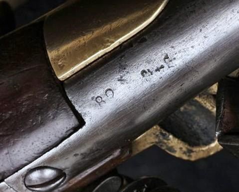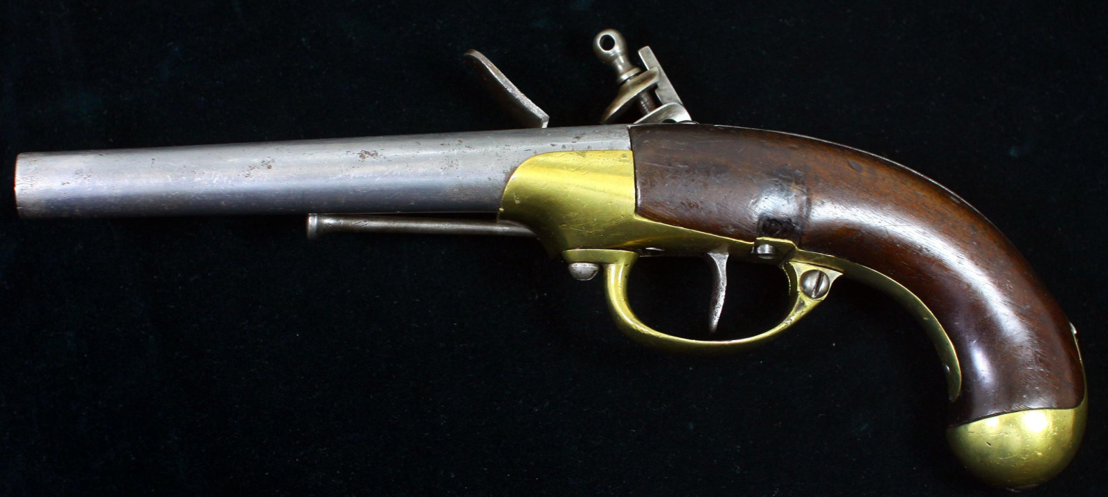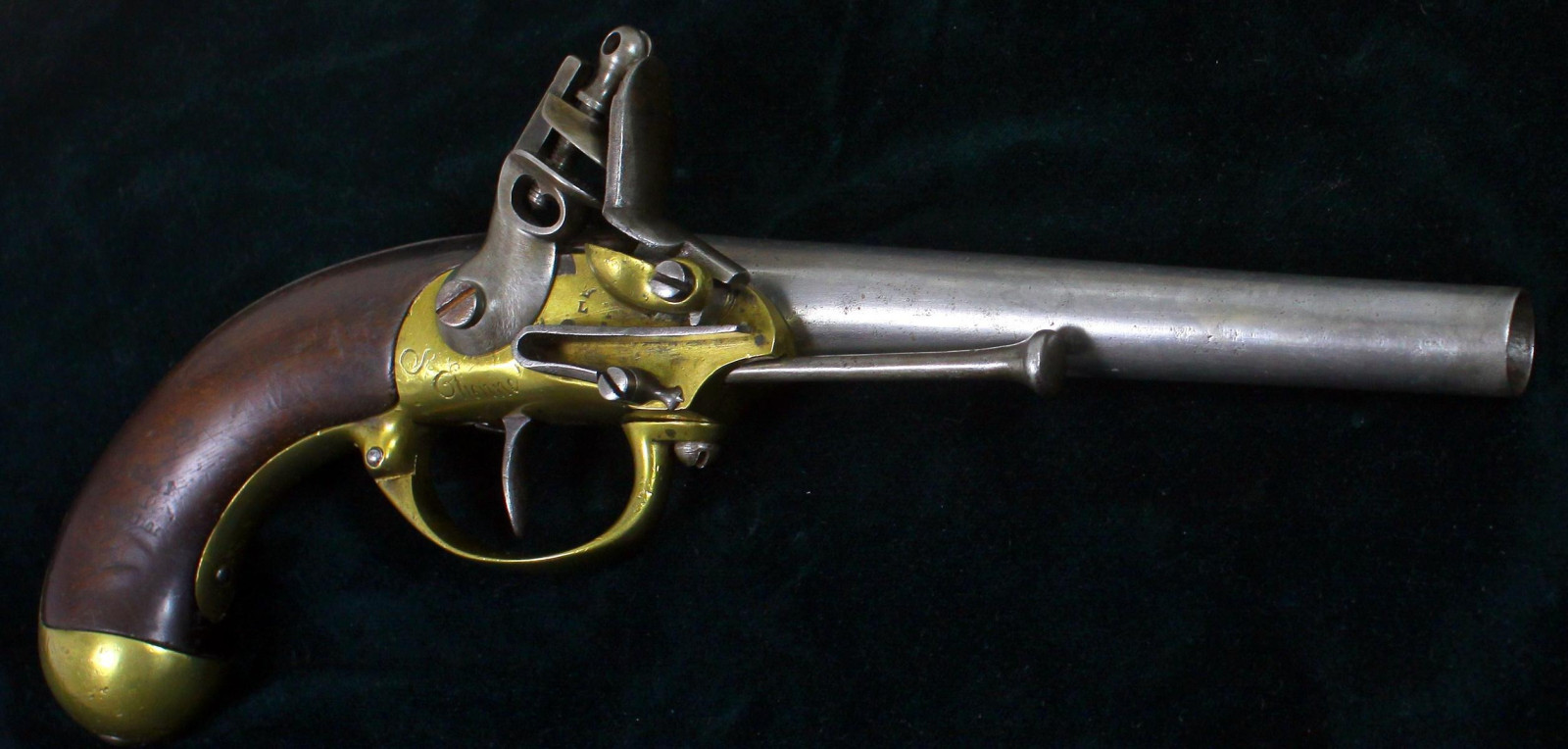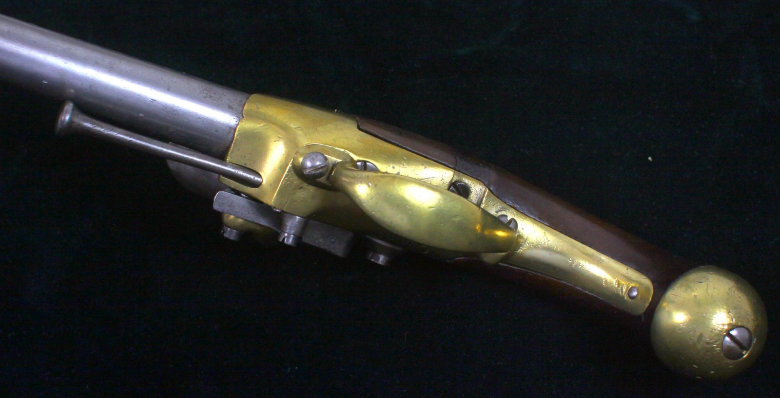 Schlosskasten aus Messing, bezeichnet "St. Etienne" Griff aus Nussholz Eiserner Ladestock. Inspector-Marke L unter Krone