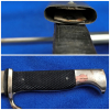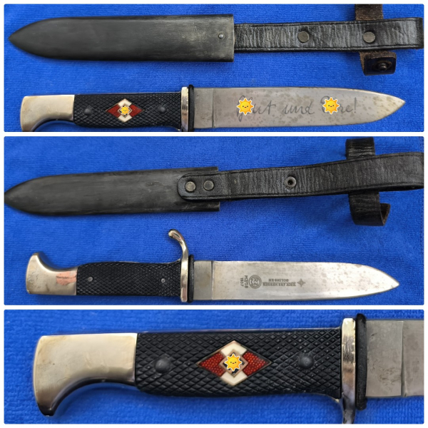 RZM M7/18 aus SOLINGEN. Es befindet sich in einem guten Zustand mit Gebrauchsspuren, da es ja auch benutzt wurde. Die Klinge hat eine schöne Patina, länge 140mm. Stoßleder ist OK. Hersteller und Devise sind gut lesbar. Die magnetische Stahlblechscheide hat eine schöne Brünierung und zwei innenliegende Haltefedern. Trageleder Top.