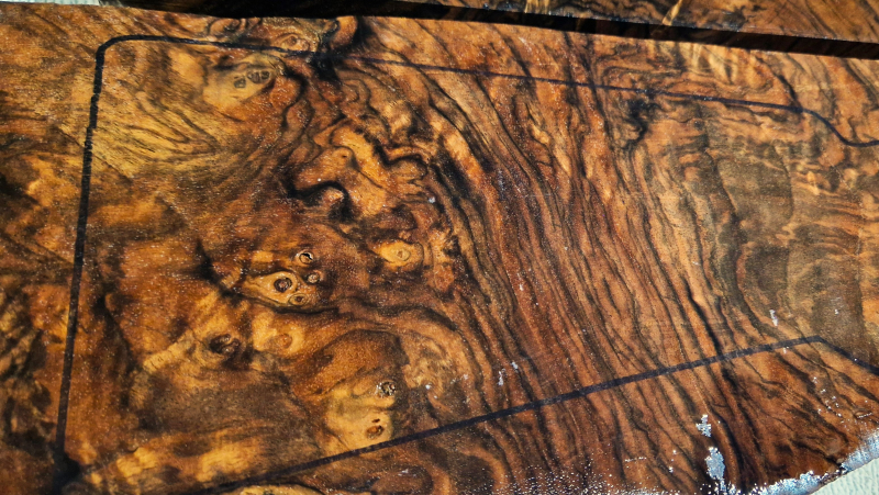 Die ersten Fotos wurden auf einem leicht feuchten Holzstück aufgenommen, um die Farben besser sichtbar zu machen. Das letzte Foto zeigt die Maße in Zentimetern. Die Umrisse entsprechen den tatsächlichen Abmessungen der Blaser F3. Die Stücke wurden über fünf Jahre luftgetrocknet. Sie wurden nicht dampfbehandelt, um die Farben und Kontraste des Tscherkassy-Nussbaums zu erhalten. Sie wurden gegen Holzwürmer und Insekten behandelt.
