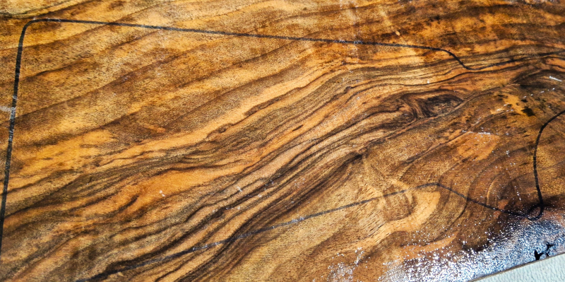 Die ersten Aufnahmen entstanden auf einem leicht angefeuchteten Holzbrett, um die Farben und die Schönheit des fertigen Produkts realistischer darzustellen. Das letzte Bild zeigt die Maße in Zentimetern. Die Konturen wurden auf die tatsächlichen Abmessungen der Blaser F3 übertragen. Die Teile wurden fünf Jahre lang luftgetrocknet. Auf Dampftrocknung wurde verzichtet, um die Farben und die natürlichen Harze des Holzes zu erhalten. Das Ergebnis ist ein elastischerer, festerer und schönerer Schaft
