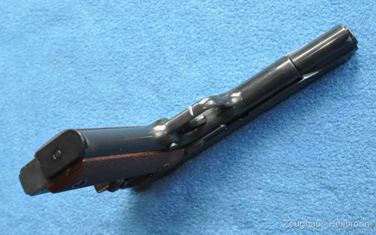 Unserer Ansicht nach ungeschossen, am Schlitten eine Fehlstelle in der Brünierung vom Lederholster (war als Dekoration an einer Puppe). Sicherung funktioniert nicht immer, d.h. obwohl entsichert löst der Abzug nicht aus. Wenn man dann die Sicherung erneut betätigt, manchmal auch mehrmals notwendig, geht es wieder. Wir verkaufen die Waffe deshalb als defekt.