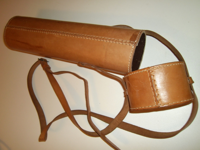 Altes Leder-/Teleskopetui mittelbraun für z. B. Teleskop/Fernrohr, Höhe 35 cm, leicht oval 9 x 7,5 cm. Transportbox mit Trageriemen ggf. auch für Pfeile beim Bogenschiessen. Stabiles Leder, Köcher innen gefüttert.