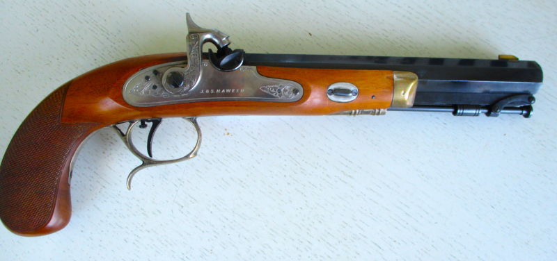 Sie bieten auf eine Perkussionspistole Hawken Cal 45, Hersteller Bondini. Die Waffe ist gebraucht und im guten bis sehr gutem Zustand.