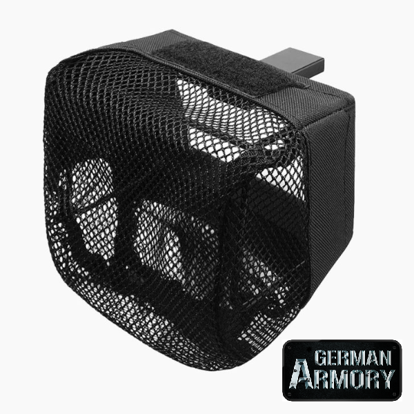 Leichter Stoff und Cordura. Wird oben auf der Waffe montiert. Der Kasten mit dem Sack ist über einen Schnellverschluss jederzeit von der Montage auf der Waffe zu trennen. Es sind alle nötigen Teile mit dabei. Wenn Sie eine zweite Aufnahme für eine zweite Waffen brauchen, können Sie die für 10€ extra erwerben.