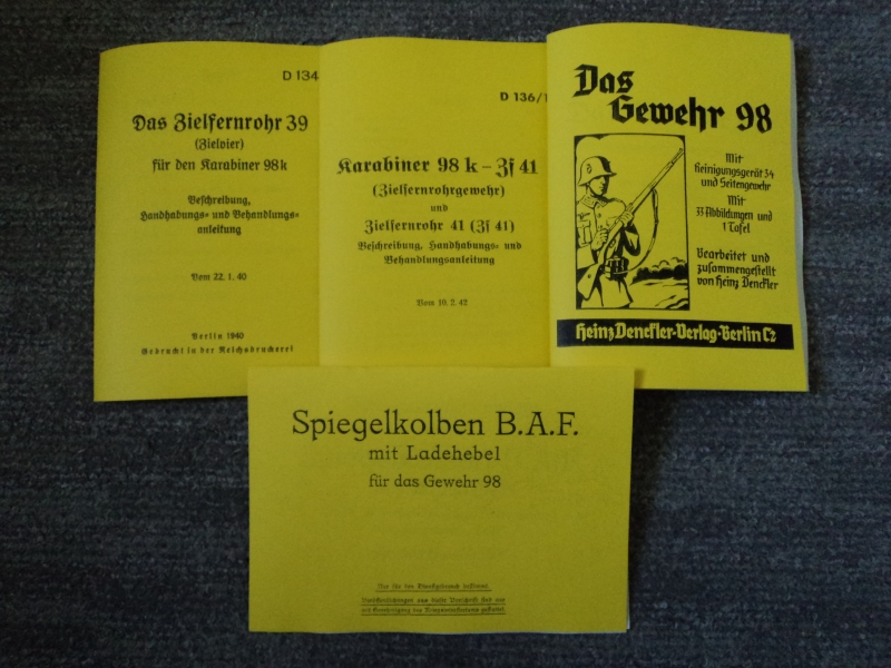 Verkaufe 4 Hefte DIN A5 Beschreibung Dienstanweisung Zielfernrohr 39 & ZF41 von K98 (1940/42) & Gewehr 98 (wie K98) & Spiegelkolben 1.WK. Kein Orginal! Neufertigung - Reprint. Versandkosten in Deutschland 2 Euro und weltweit 3,5 Euro. Zustand und Umpfang siehe Foto.