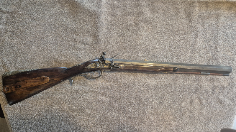 Hoheitl.adliges,halbschäftiges Kurzgewehr L.85 cm Kal.17mm Lauflänge mit fein gravierter Laufhalterung 54 cm.Oktogonaler sehr dickwandiger,konischer Lauf,an der Mündung leicht gestaucht,mit höhenverstellbarer Messingkimme,eingelassenem Messingkorn.Auffälliges reliefiertes Schlossblech und Schlossgegenblech mit vielen Jagdmotiven,auch Hahn und Pfannendeckel ebenso plast.verziert,das alles auf vergoldetem Untergrund.Exorbitante,plastische Bronzemonturen mit jagdl. Motiven,Hirsche Hunde Wälder u.v.m.Der Nußholzschaft ist stark beschnitzt (verschnitten)Das Daumenblech aus Bronze stellt ein Wappen dar.Der Schaft ist hochglänzend,hat einige alte fachmännische Ausbesserungen,eine beschnitzte Backe,im Schuber sind noch einige Eisenkugel vorhanden.Der Schaft endet vorn mit schwarzem poliertem Horn.Ladestock aus Holz.Sammelwürdiges Kurzgewehr