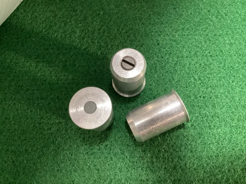 Verkaufe drei gebrauchte Aluminium-Pufferpatronen des deutschen Fabrikats L. WALTHER, Kal. 16, Kunststoffpfropfen als Zündhütchenersatz, Zustand siehe Foto.
