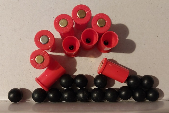 10x SPEER Plastikülsen/ Trainingshülsen, (gezündert: empfehle CCI Magnum Large Pistol Primers No. 350), Indoor-Übungsmunition mit passenden, wiederverwendbaren Gummikugeln; Kaliber 38 bzw. 357 Mag.