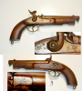 Original Perkussions-Pistole, Militärpistole der Ost-Indien Kompanie nach dem Vorbild der englischen Tower-Pistole, Systemplatte mit indischen Schriftzeichen und auch auf dem Lauf indische Markierungen, Gebrauchsspuren, der Ladestock fehlt, technisch in Ordnung, Lauflänge 20,4 cm, Gesamtlänge 36,4 cm, Kaliber 16,5 mm