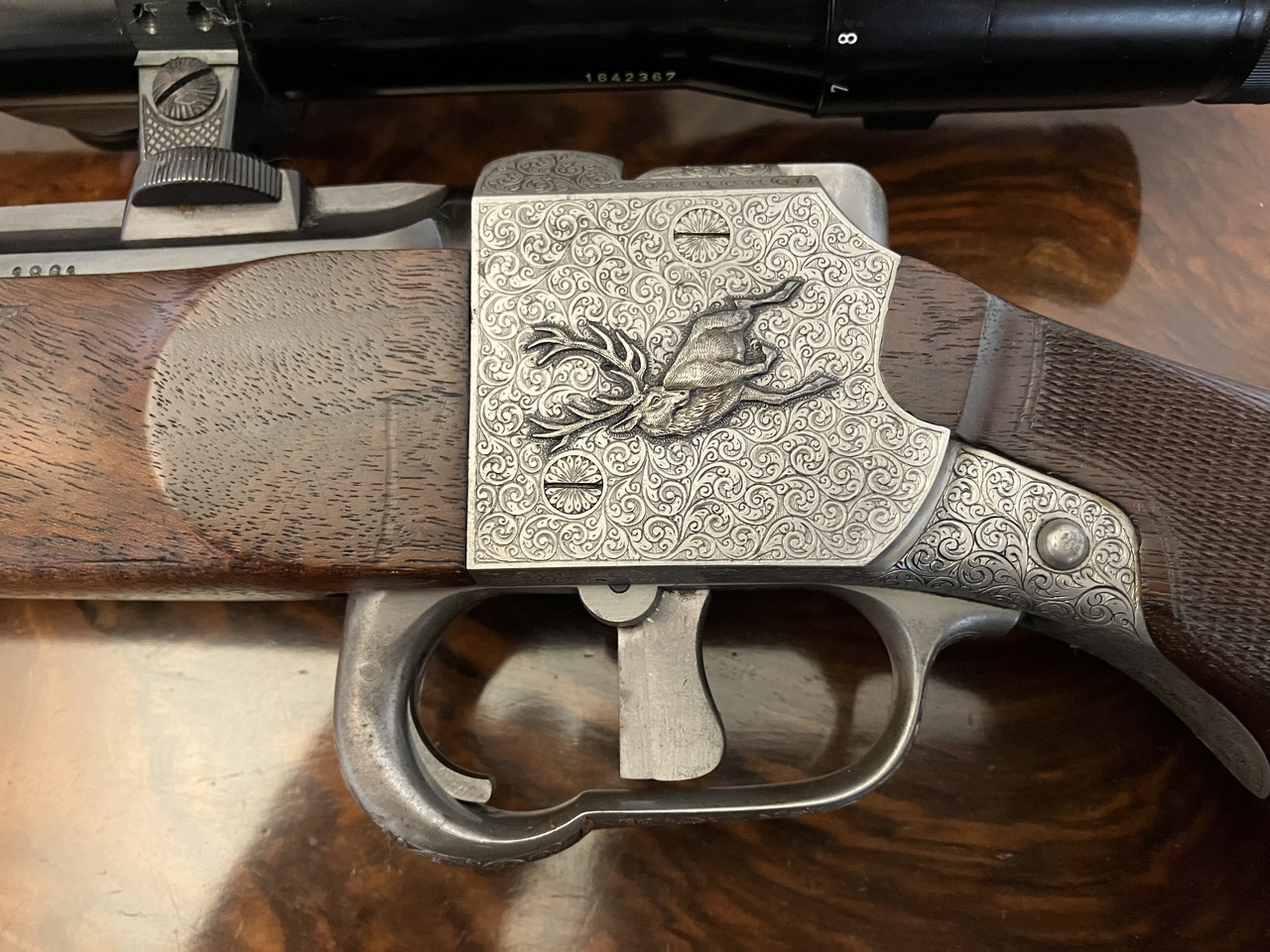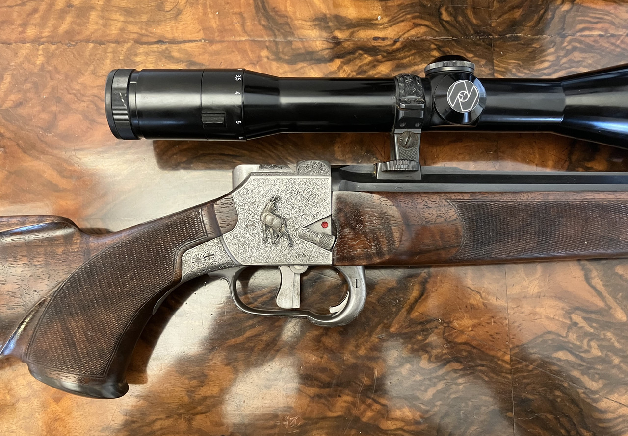 Versteigert wird die abgebildete Büchse inklusive Matrizen, Hülsen, Zielfernrohr und Montage. Der Blockverschluss Typ Graf Heeren ermöglicht eine einzigartig kurze Baulänge bei großer Verschlussfestigkeit und geringem Gewicht. Die Waffe kann im Anschlag innerhalb des Abzugsbügels blitzschnell und lautlos ge- und entspannt werden (Handspanner). Somit ist es möglich, die Waffe trotz Patrone im Lauf entspannt und sicher über anspruchsvolles Gelände zu tragen. Durch die kurze Baulänge der Waffe in Verbindung mit der Handspannung ist das Gewehr ideal für die Bergjagd auf Hochwild geeignet : - )
