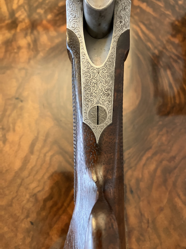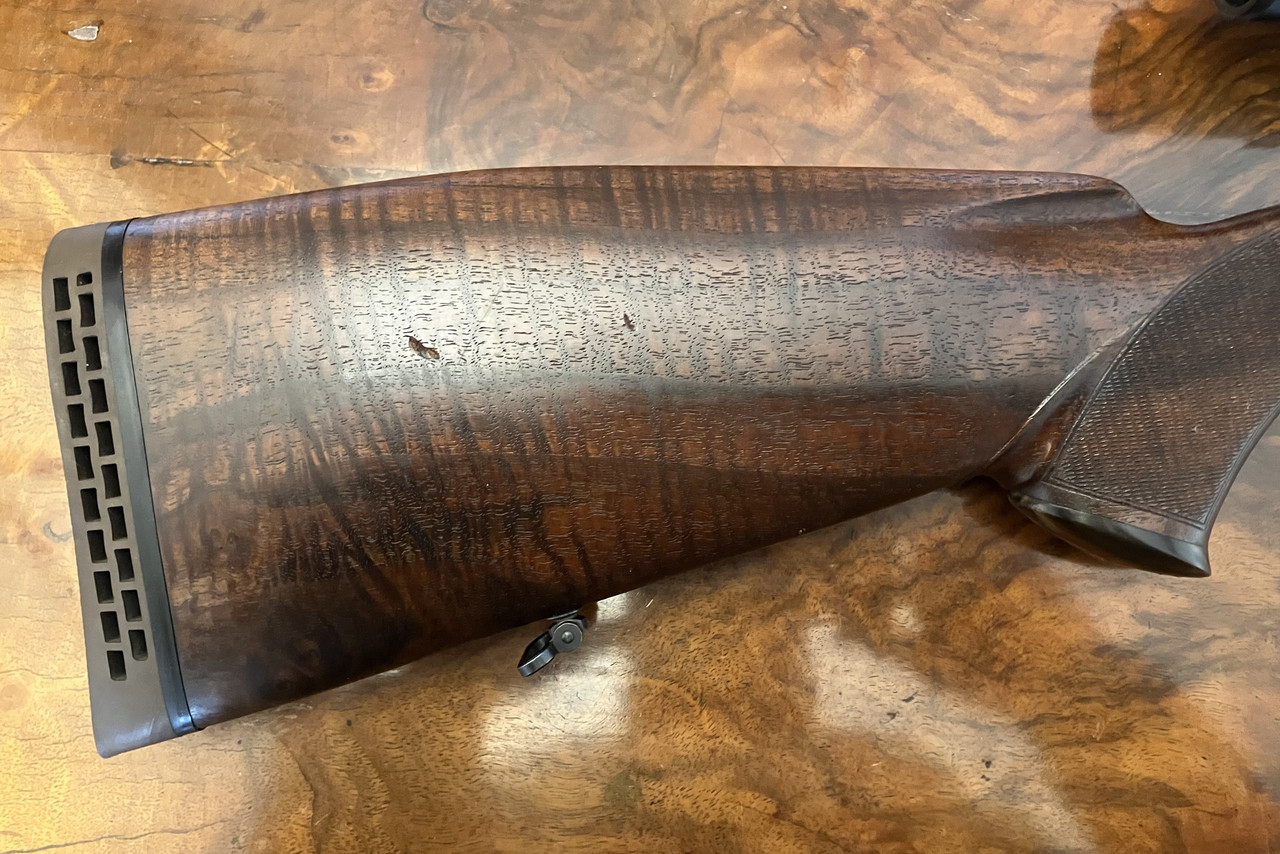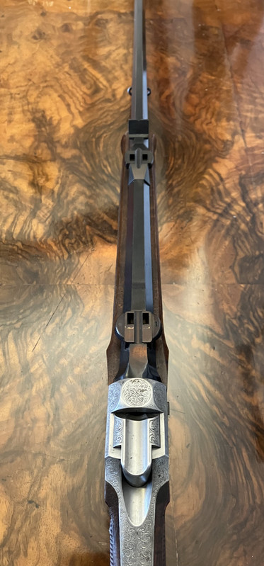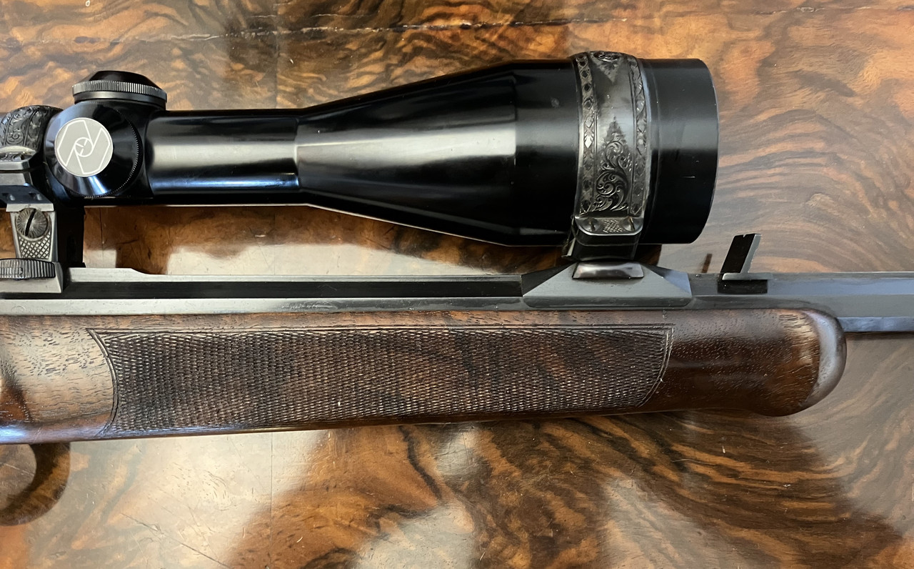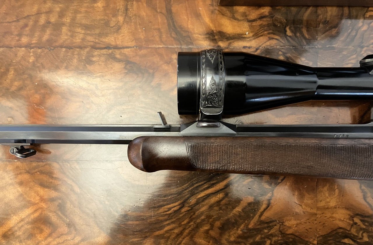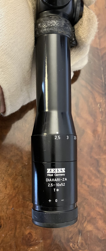 Die Waffe wurde nach ihrer Fertigstellung jahrzehntelang gelagert, bisher noch nie jagdlich geführt und erstmalig im Jahr 2024 beschossen. Der 65cm-Achtkantlauf verfügt über eine integrale Schiene und ist hervorragend gepflegt. Züge und Felder sind scharfkantig. Die Schaftlänge (Abzug bis Schaftkappe) beträgt ca. 38,5 cm. Auch die Linsen des Zielfernrohrs Zeiss DIAVARI-ZA 2,5-10×52 T*, Absehen 4, sind sehr gut gepflegt : - )