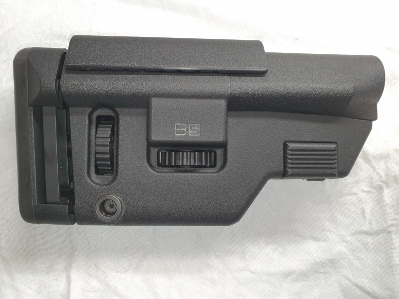 Der B5 Systems Collapsible Precision Stock medium verfügt über eine verstellbare Wangenauflage und Schaftkappe, sowie beidseitige Riemenhalterungen. An der Unterseite des Schafts befinden sich M-Lok -Schnittstellen zum anbringen von Picatinny-Schienen. Ein AR-15 kann auch bei komplett eingeschobenem Schaft durchgeladen werden.